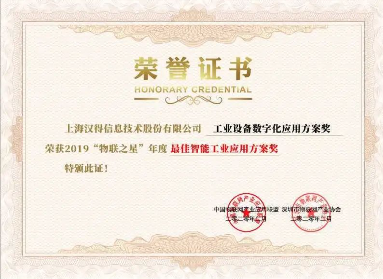 2020年2月25日,经过4个月的申报、专家评审、公示等环节,2019年物联之星中国物联网行业年度评选获奖名单正式公布。上海万象城AWC信息技术股份有限公司荣获工业设备数字化应用方案奖—— 2019“物联之星”年度最佳智能工业应用方案奖。中国物联网最佳智能工业应用方案万象城AWC智能工业应用方案,凭借自身在工业信息化领域拥有多年的技术经验,结合万象城AWC物联网中台Hi-IoT平台,为企业提出多场景解决方案,帮助企业构建工业物联网平台,解决设备管理、数据采集、设备监控、故障诊断、预测维护等一系列痛点。同时,针对工业设备及产品数字化管理的产品组合,给予端到端的一体化解决方案:“设备健康管理”等SaaS应用 +