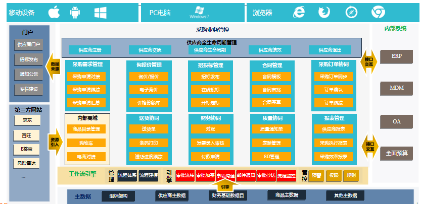 闭环可视化的供应商生命周期管理体系,可帮助集团实现从供应商注册、资质评审、绩效考核至供应商资料管理全程可视化,助力构建集团统一的采购平台,使采购过程数据真实完整,采购业务阳光透明、可追溯。