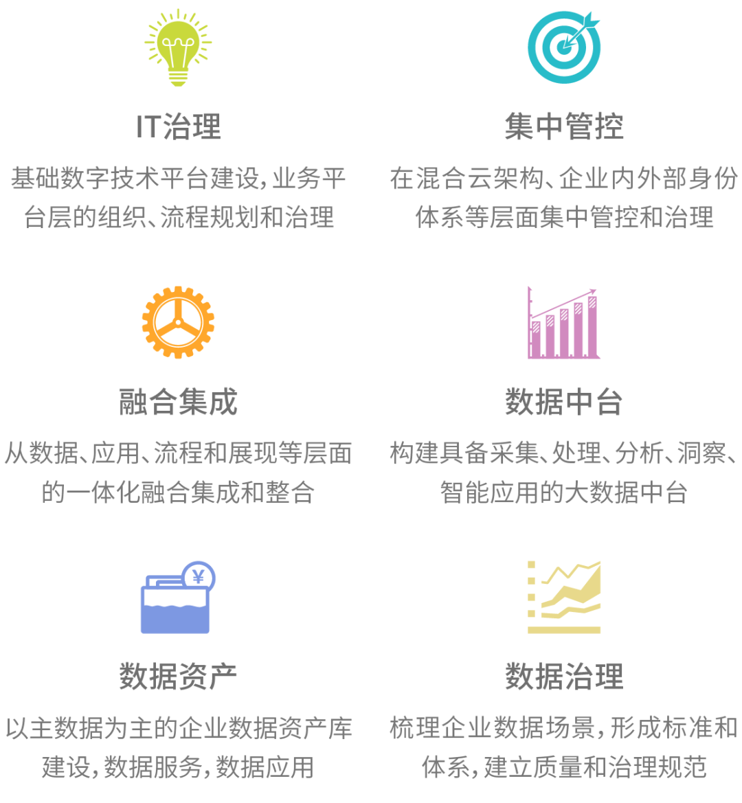 究其数字化的本质,应该就是以数字化技术为基础,并以数据为核心来组织我们的流程和产品架构,以进一步提升企业综合竞争力和大规模精益创新的能力。基于此,越来越多的企业在信息化建设中开始重视IT治理和数据治理等基础治理业务,尝试顺利获得构建企业统一基础架构和数据治理平台,支撑和促进企业的升级与快速转型。
