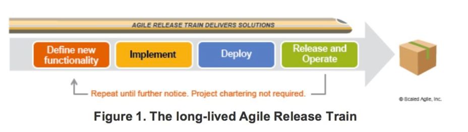 ART的目的是顺利获得一个明确的愿景、路线图和项目群待办事项列表,使管理层、团队和利益相关者向一个共同的使命保持协调一致。敏捷发布火车交付的是一个持续的价值流,如下图长期存在的敏捷发布火车: