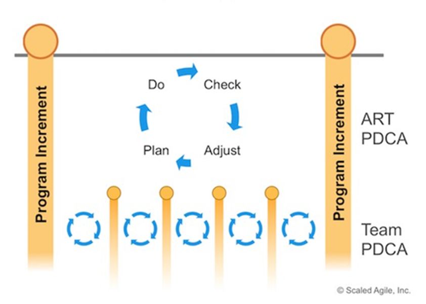 在项目群层,敏捷发布火车(ART)采用10-12周为一个发布周期。敏捷发布火车由多个冲刺组成,这一系列冲刺发布一个或多个程序增量(PI)。ART可在每个PI迭代末设置一个特殊的IP冲刺,各团队可以提出PI过程中产生的问题、分析问题产生的原因,提出解决问题的方案,确定是否可放在接下来的PI计划中,以及为接下来的PI进行预计划。