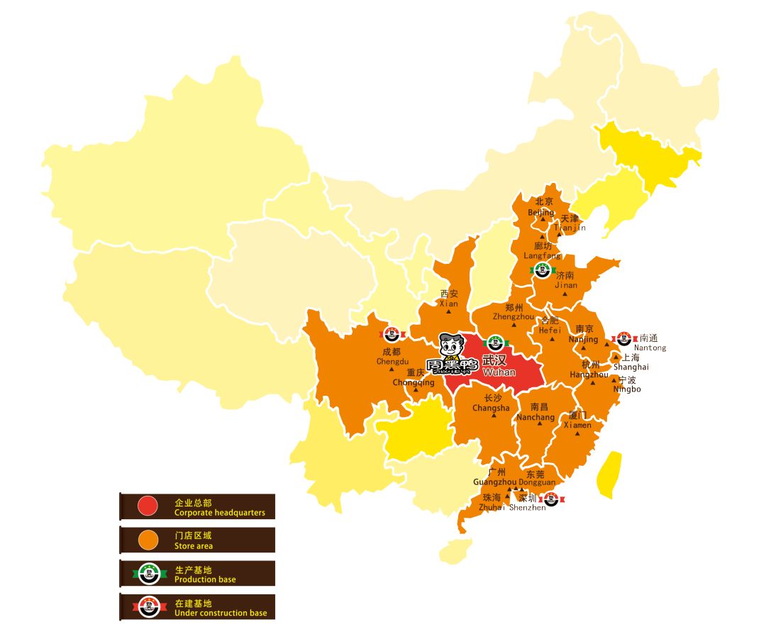 拥有数百家直营门店遍布北京、河北、天津、重庆及武汉、广州、长沙、杭州、郑州、南京、南昌等省会城市,同时分别在湖北省武汉及河北拥有两个大型现代化生产中心,为支持不断扩充的零售店铺网络及不断开展的网上渠道,正规划建设新增华东、西南地区及华南地区生产中心。