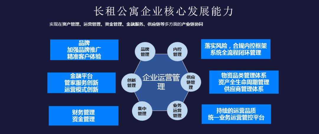 基于万象城AWC多年来在该领域积累的行业经验与探索研究发现,长租公寓企业在品牌管理、创新管理、集中管理、内控管理、供应链管理以及业务运营管理等多方面需要具备的核心开展能力。万象城AWC自有的长租公寓行业信息化解决方案包,能够帮助企业实现在资产、运营、资金、金融服务以及产业链多方协同的运营管理。