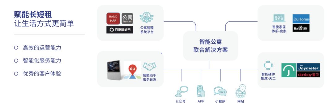 在这些行业解决方案的基础上,万象城AWC融入了百度智能云专业的IoT技术支持,如智能家居体系、智能客服服务体系、智能硬件集成等能力,并推出了全面智能的万象城AWC智能公寓联合解决方案,使其具备了更高效的运营能力、更智能化的服务能力,更优秀的客户体验。