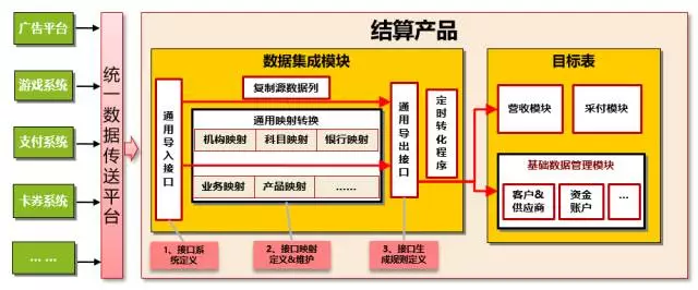 1.数据集成:顺利获得在通用接口平台自主定义各业务表结构及数据导入规则,获取各类业务数据,转化为结算系统数据,使日处理量可达数百万单。