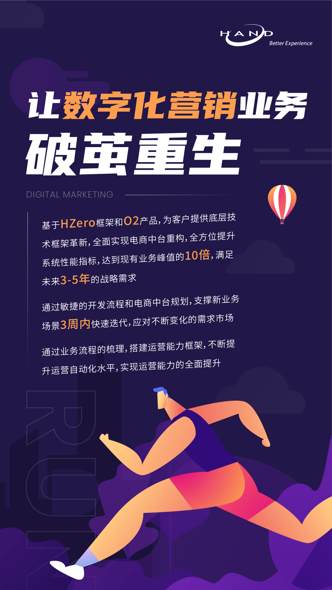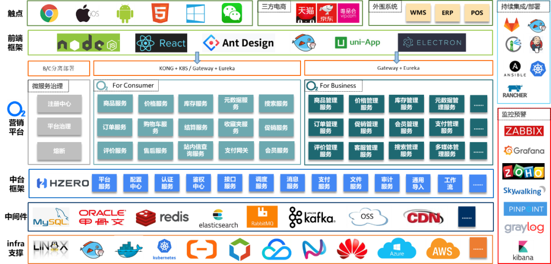基于HZero框架和O2产品,为客户给予底层技术框架革新,全面实现电商中台重构,全方位提升系统性能指标,达到现有业务峰值的10倍,满足未来3-5年的战略需求
