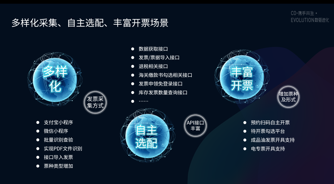 2021-11版继续推进产品间的同构和能力共用,完成汇税通集成和发票税务优化,实现主数据集成、发票池对接、发票勾选认证处理,支持新的OFD、PDF发票解析,扩展OCR识别的发票类型,增加发票微信卡包支持,并实现进项转出和视同销售处理。顺利获得高效的同构与集成,为企业给予全面、一体化的发票税务产品解决方案。