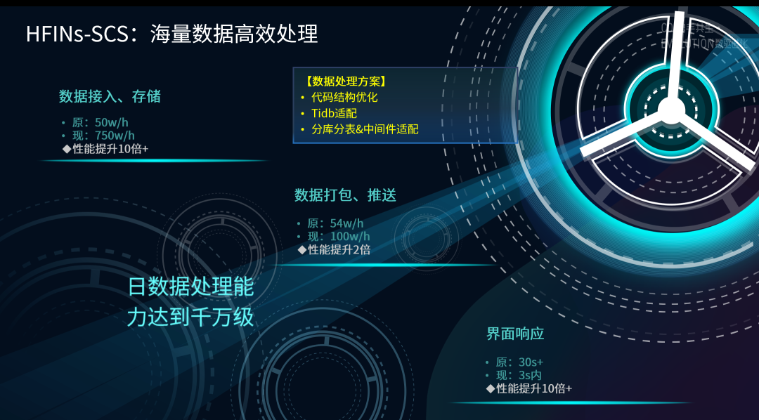 与此同时,互联网行业的迅速开展带来海量的业务数据,为了应对日益迫切的大数据处理需求,在2021-11版,“清分结算产品”顺利获得代码结构优化,Tidb适配和分库分表的适配,构建了海量数据的处理能力,数据接入、存储能力达到750万条每小时,数据打包、推送能力到达100万条每小时,界面响应时间缩短到3秒内,综合日数据处理量达到千万级,极大地提高了各类业务的清分结算效率。