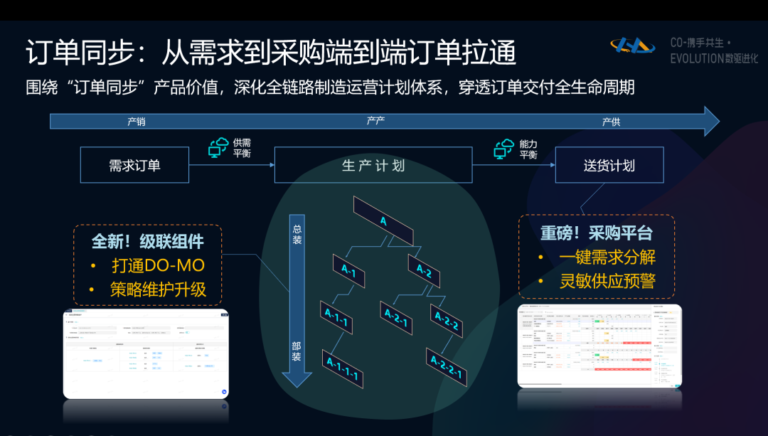 计划作为HCM的核心领域,围绕“订单同步”的产品价值,HCMp为制造企业给予从需求到采购端到端订单拉通的提升服务。此次版本在前一版本生产计划闭环的基础上,将“订单”的含义扩展为产供销一体化的业务对象,囊括“需求订单”、“制造订单”、“生产指令”、“采购订单”以及“送货订单”。一方面横向延触至备料送货计划的深化应用,帮助制造企业打造更健壮、更透明、更敏捷的全链路计划体系。另一方面,以精益为灵魂、“拉动”为指导思想,纵向贯穿级联树,使所有变更都能一键穿透,敏捷响应,真正发挥生产计划统一指挥、统合综效的强大中枢作用。