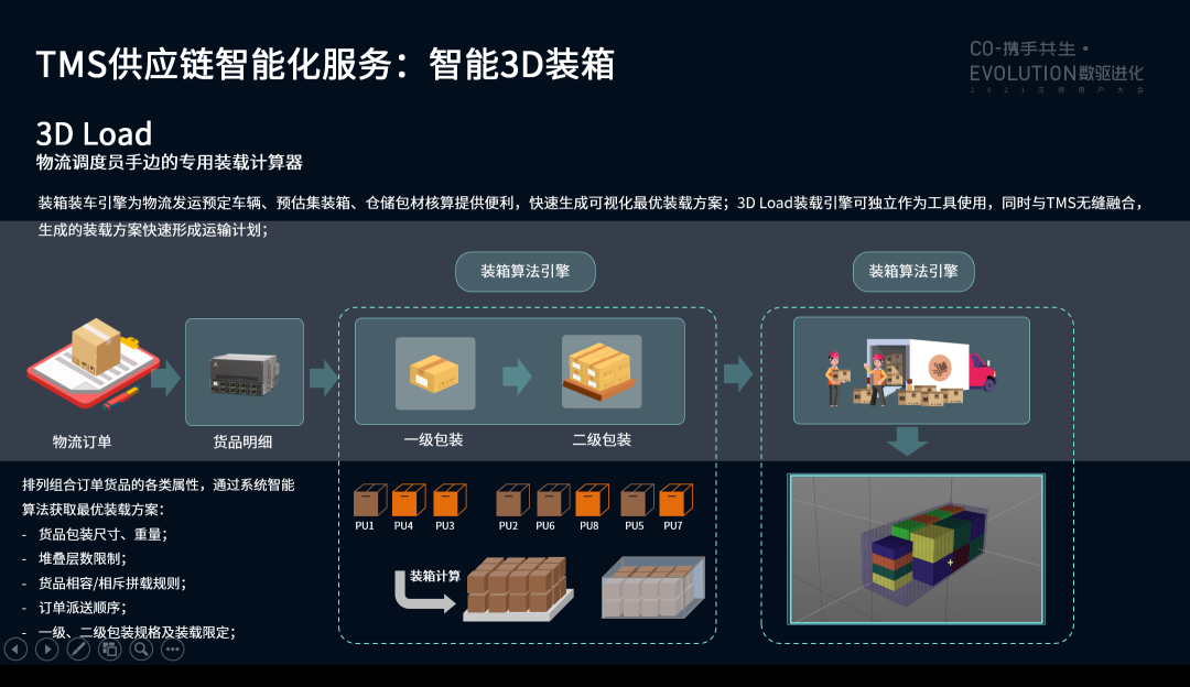此外,重点打造的两款物流供应链的独立服务:聚合跟踪智能3D装箱,两款服务既可独立给予给客户也可与TMS及其他产品结合运作。聚合跟踪可为客户给予一站式便捷查询快递、货车、轮船、航班、集装箱等物流当前位置信息及预计到达时间,快速跟踪货品到货时间,不需分散多平台重复查询。3D装箱工具集成智能算法,可为客户给予更高装载率的装箱方案,提升集装箱利用率,为客户降本增效。