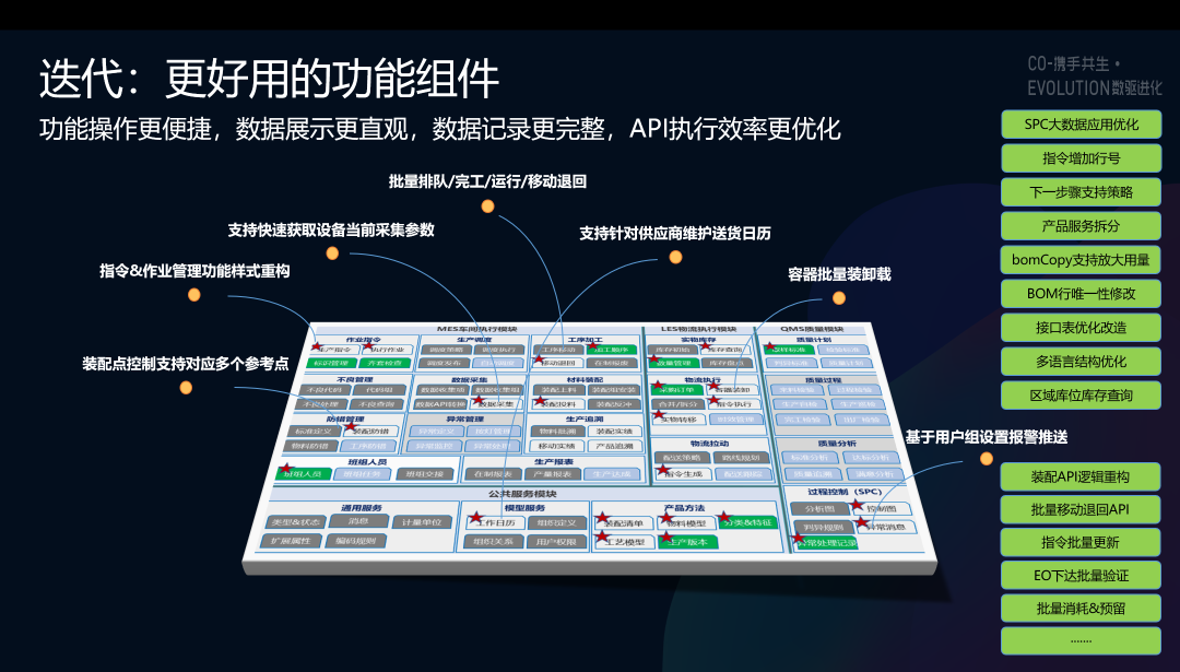 在场景覆盖方面,增加人员管理、抽样规则、寻址和IIOT等新的组件。人员管理部分,支持人员班组技能管理,实现技能权限的验证,以及上下岗实际工时记录;抽样规则部分,支持国标2828计数和6378计量型抽样方案,同时也支持用户结合自身业务定制抽样方案;寻址部分支持顺利获得策略定义支持用户在最小路径的前提下实现定址定位,先进先出等业务管控要求;与此同时新增IIOT模块,实现边缘网管的集中管理,给予数据监控和触发的自动化机制,支持和外部应用系统的接口交互,结合设备联网组件更好地帮助企业实现IT和OT业务融合。此外,还新增了在制品队列管理、SPC异常点管理、顺序补货等新的场景。