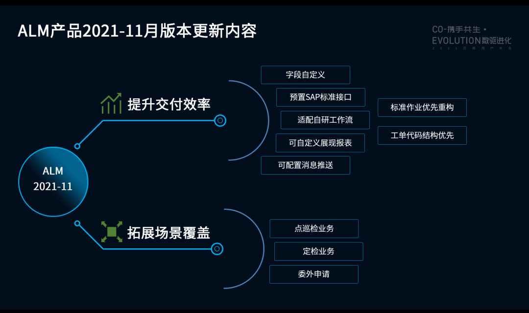 本次产品主要从提升交付效率场景覆盖拓展两个方向进行优化完善。包括功能界面动态字段的定义及应用,给予更灵活的功能界面自定义调整,使用配置来减少界面需二次开发。顺利获得预置与SAP ERP的标准数据接口实现系统间快速集成,适配HZERO自研工作流及消息通知服务,满足业务节点提醒及业务流审批灵活可配的需求。为进一步覆盖专业化的设备维修场景,补充点巡检管理、设备定检管理及委外维修业务的功能,拓展适用范围。