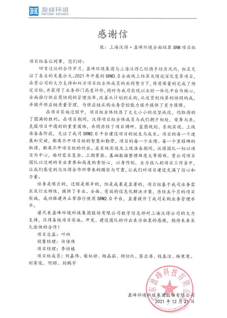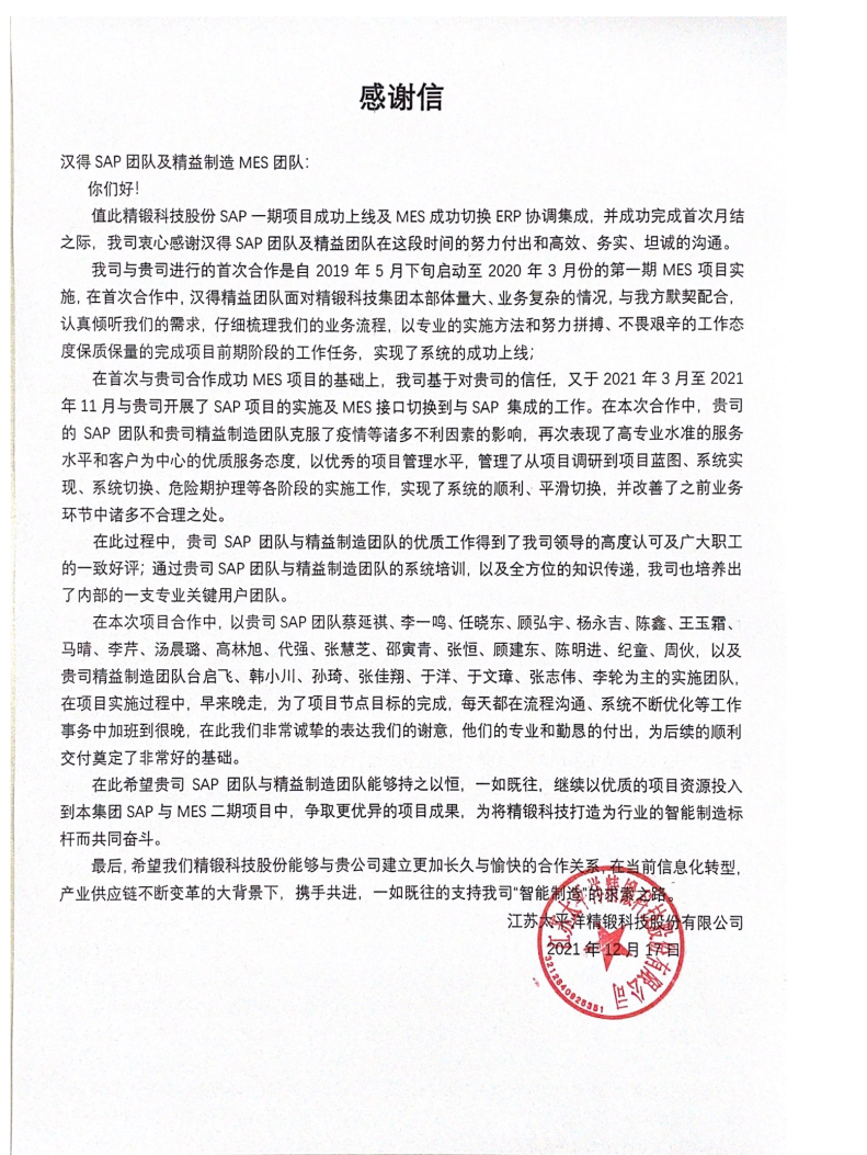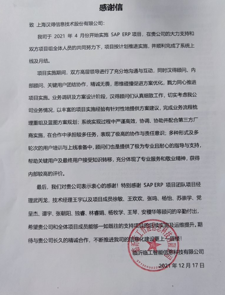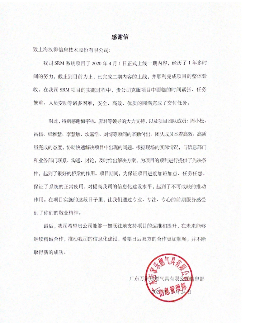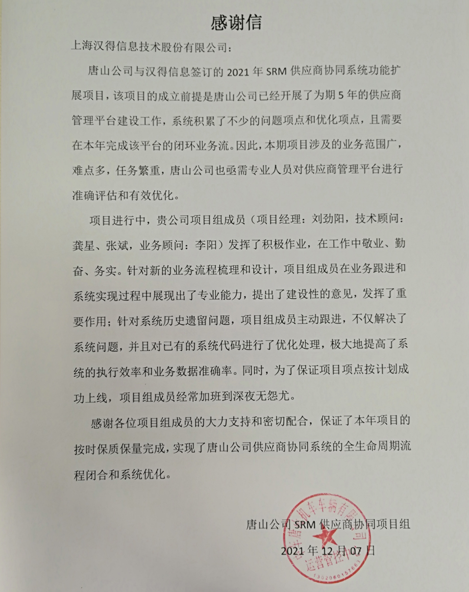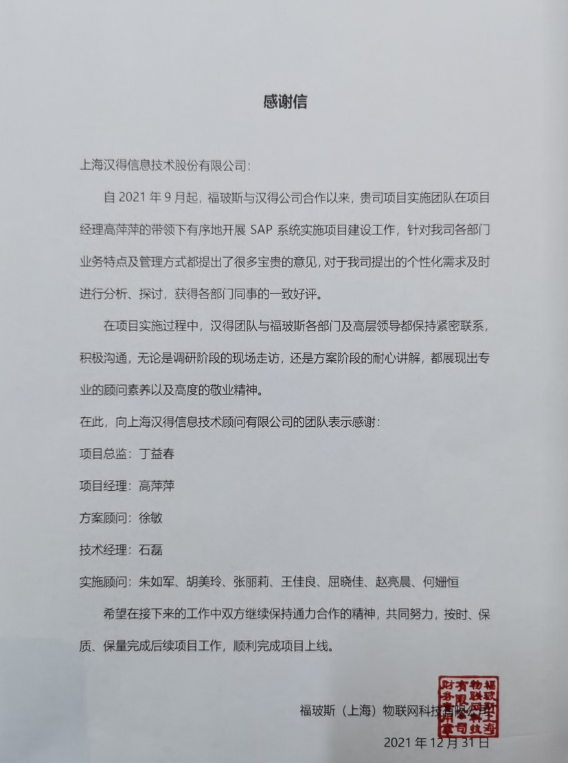 “过去一年,我们在陪伴企业数字化转型的道路上,坚持自主创新,努力自我进化,将服务能力‘进化’成更高形态。 当数字化领域不再有低垂的果实,面对企业在各领域数字化转型的复杂挑战和不确定性环境,能够互相支持,携手同行的唯有坚持长期开展、长远价值的伙伴。 士以弘毅,感怀重托长相伴;任重道远,励将荆棘踏坦途。 万象城AWC感怀客户重托,唯有不断努力超越自我,持续提升服务能力,在每一个客户的数字化转型项目上,坚持创造以‘软件工具扎根企业业务环境’的核心价值,以‘给予行业特征和管理经验的知识沉淀咨询服务’的形式价值,以‘陪伴企业持续进化促进变革发生’的情绪价值,感谢企业客户的信任托付!” —— SAP咨询服务事业部总经理 智协供应链事业部总经理 陆嫕颖 智协供应链 以下收录了部分客户感谢信 << 滑动查看下一封感谢信 >> 烽火通信 经过烽火通信项目组成员和万象城AWCSRM顾问团队共同奋斗,同心协力,顺利获得SRM项目重新梳理整合了采购管理业务流程,提升业务管理水平,提高烽火通信的信息化水平,从初夏到冬至,解决了一个又一个问题,度过了一个又一个难忘的日夜,项目组的辛苦我们看在眼里记在心上,随着烽火通信SRM项目逐步推进,现在处于系统上线准备的阶段。在此对于给予项目大力支持和付出辛勤劳动的顾问们表示由衷的感谢! 中电科电子装备 在中电科SRM项目实施过程中,万象城AWC顾问严谨、敬业的工作态度和高效专业的工作能力让我们印象深刻。展望未来,我们衷心希望能与贵公司一道紧密合作,与贵司建立更加长久而愉快的合作关系,共同向着助推中电科电子装备集团以及旗下子公司成为世界一流的行业领军企业的愿景前进! 一汽大众 我们一起见证了一汽-大众企业电子商城项目的每一个难忘瞬间及每一个里程碑的取得,借助企业电子商城平台我们有信心进一步提升MRO采购管理能力,全面提升信息化水平。经过商城项目的实施,对协议引入、商品管理、费用申请、预算控制、审批、下单等业务进行了全面的定制和开发,覆盖了一汽-大众MRO品类全部领域,显著提升了一般采购管理熊力,很多创新性解决方案的落地也极大地提高我司MRO各品类采购作业的效果。 昆山农商银行 经过这段时间和贵公司的合作,贵公司的SRM系统能够根据业务需求进行灵活调整,将系统功能与实际业务进行有效融合,将各部门的采购需求进行汇总和推进,实现了采购申请预算的跟踪和管控,将招投标流程标准化、规范化,并且顺利获得系统实现与供应商的线上对接,对于行方的供应链管理来说实现效率上的突破和流程上的创新。 华润九新药业 因为信任,所以同行。万象城AWC品质,九新见证。真挚感谢,辛劳付出。展望未来,共铸辉煌!贵司项目组顾问从实际业务需求出发,结合以往的实施经验,克服种种困难,给予优质专业的咨询服务和相应的解决方案,全方位、多视角应对我司的管理及业务变更,持续推进项目的实施与落地。顺利获得SRM平台的优化,提升合规的管理监控水平,加强合规的控制,提升合规整体运作效率。 润联科技 贵公司驻派润联采购团队的项目组成员,在我团队工作已经一年有余,贵公司顾问与我团队成员紧密配合、团结协作,在我司多个项目中均表现出超强的专业能力和敬业精神。 万家乐 项目团队成员本着高效、高质量完成的态度,协助快速解决项目中出现的问题,根据现场的实际情况,与信息部门和业务部门联系、沟通、讨论,及时给出解决方案,为项目的顺利进行给予先决条件,起到了很好的桥梁作用。 云南建投 由贵司负责实施的采购中台项目,在贵司的大力支持和双方项目组全体成员共同努力下,顺利完成一期终验。在2021年内也分别上线了分包一期项目以及各个期优化项目,也取得云上营家部门的一致好评! 盈峰环境 任务是艰巨的,过程是艰辛的,但是成果是显著的,项目组基于我司业务需求及行业特性,给予了专业全面有效的信息化解决方案,历经五个月的项目实施,成功搭建并正常推行SRM 2.0 平台,显著提升我司采购业务管理水平。 SAP咨询服务事业部 以下收录了部分客户感谢信 << 滑动查看下一封感谢信 >> 福玻斯 在项目实施过程中,万象城AWC团队与福玻斯各部门及高层领导都保持紧密联系,持续沟通,无论是调研阶段的现场走访,还是方案阶段的耐心讲解,都展现出专业的顾问素养以及高度的敬业精神。 国际物流 万象城AWC项目组基于我司业务需求及行业特性,给予SAP专业、全面、有效的信息化解决方案,本次项目SAP ERP实施实现了物流物流供应链行业煤炭、钢材等端到端管理。特别是合同管理实现了从合同到进销存到业财一体化,再到资金收付管理等闭环,实现ERP线上化,标准化,集成化管理。 国酿食品 本次SAP ERP实施建设起统一的业财一体化平台,顺利获得产供销计划联动,实现销售订单与需求计划,采购计划,生产计划的高度融合。感谢万象城AWC公司对我司信息化建设的大力支持,期待以后与万象城AWC公司的长期愉快的合作! 海正生物 海正生物SAP项目自正式启动以来,双方项目组全体成员朝夕相处、团结合作、努力拼搏,一起克服各种困难,从春天走到冬天,我们共同见证了一期、二期的每一个难忘瞬间。在项目周期紧张,任务重的情况下,万象城AWCSAP实施团队以专业的表现、敬业的态度、严谨的分析、细心的辅导,使