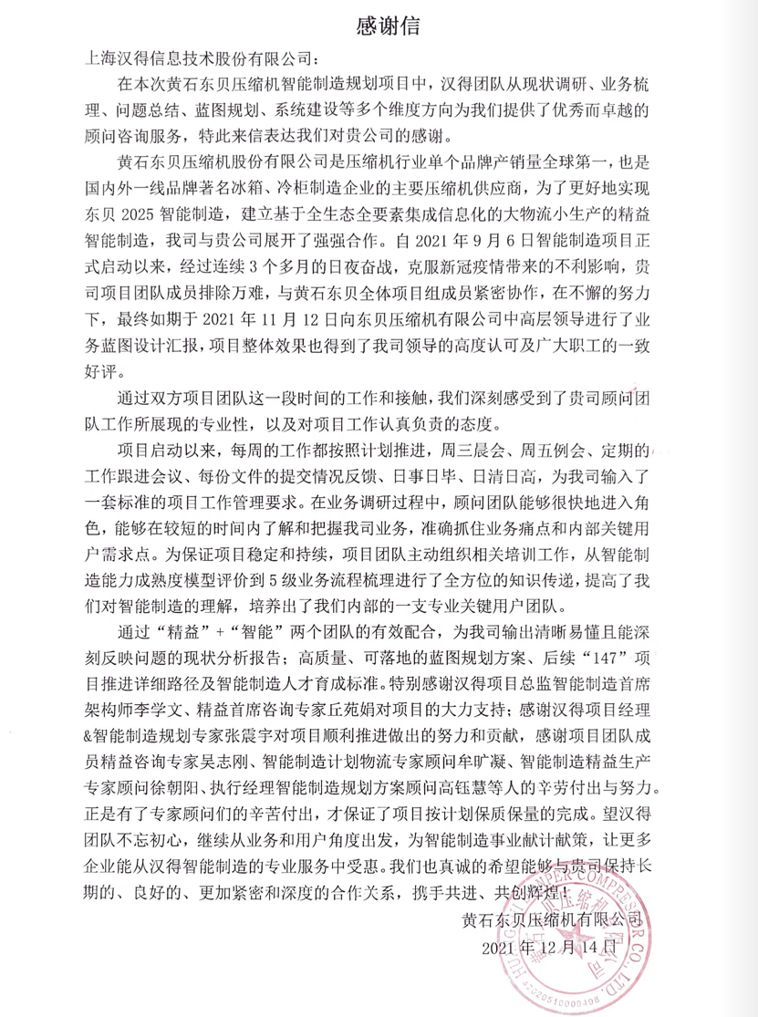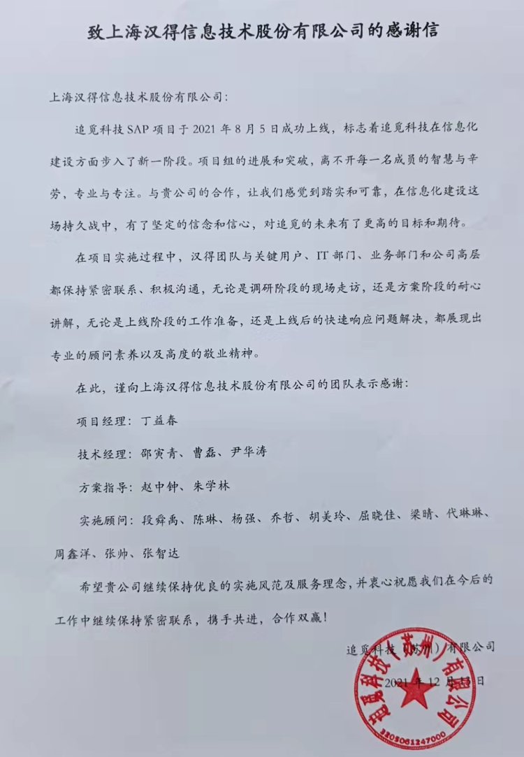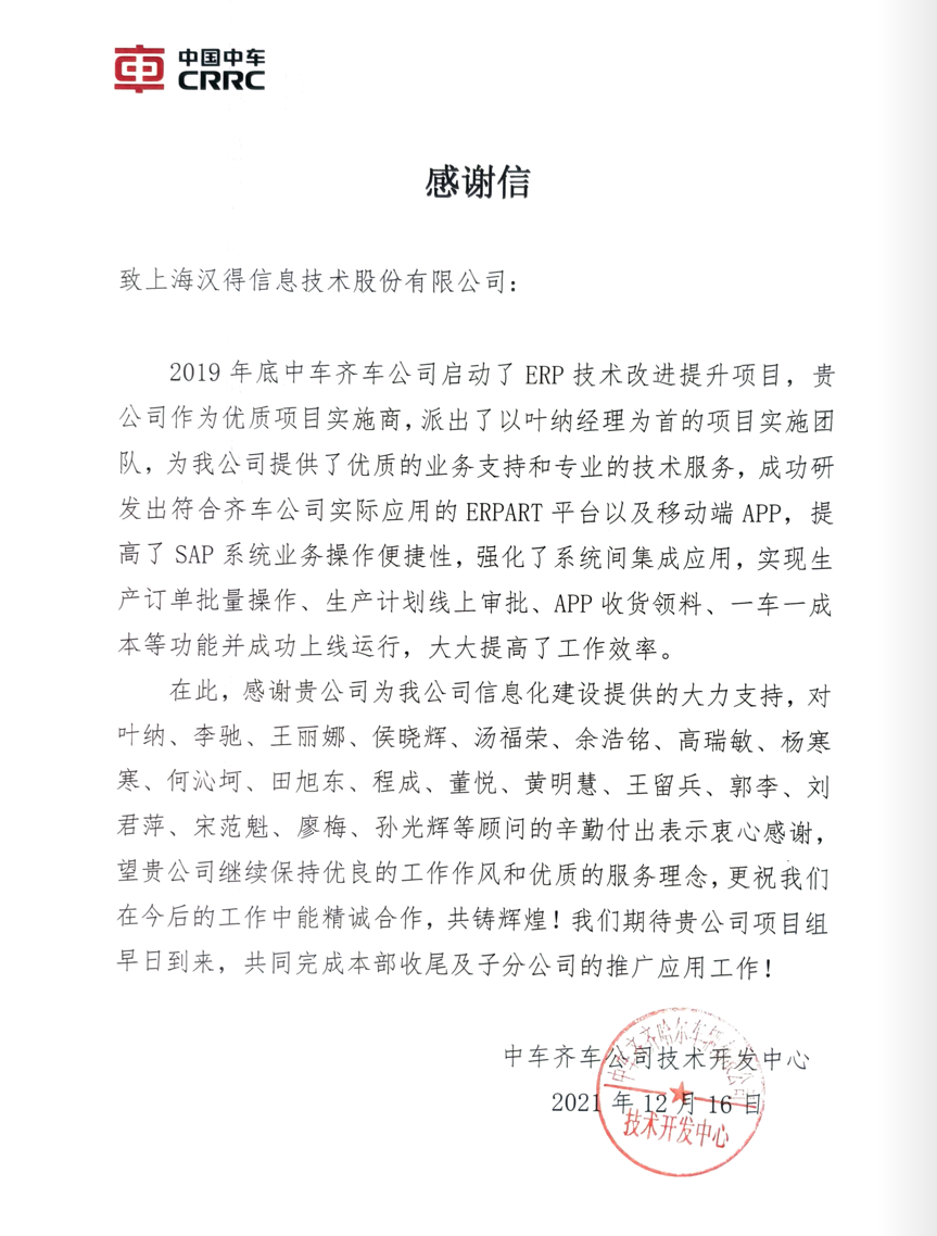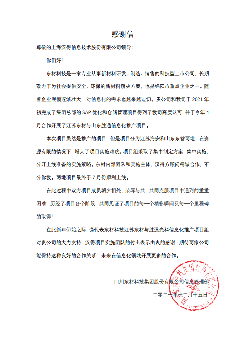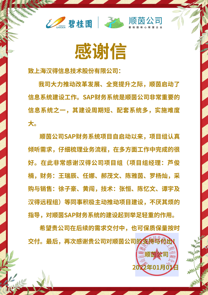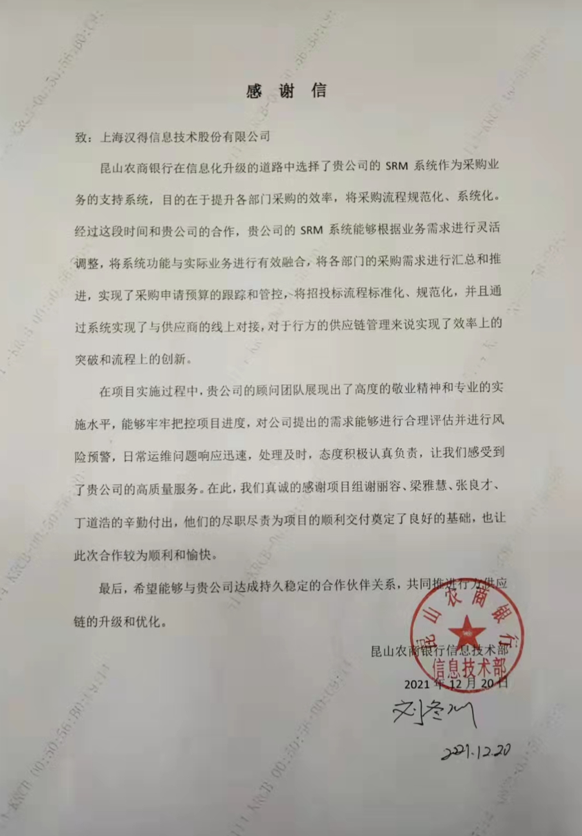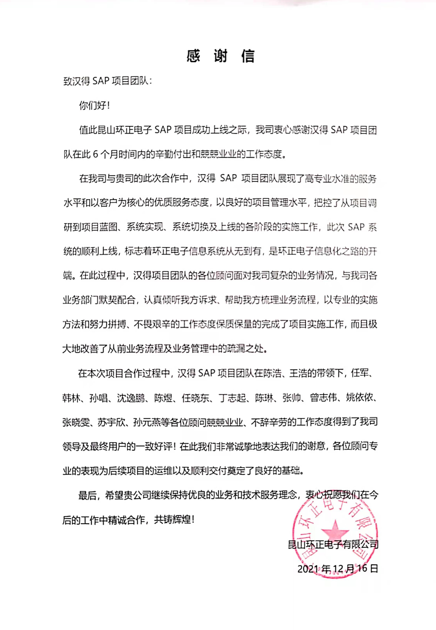 “过去一年,我们在陪伴企业数字化转型的道路上,坚持自主创新,努力自我进化,将服务能力‘进化’成更高形态。 当数字化领域不再有低垂的果实,面对企业在各领域数字化转型的复杂挑战和不确定性环境,能够互相支持,携手同行的唯有坚持长期开展、长远价值的伙伴。 士以弘毅,感怀重托长相伴;任重道远,励将荆棘踏坦途。 万象城AWC感怀客户重托,唯有不断努力超越自我,持续提升服务能力,在每一个客户的数字化转型项目上,坚持创造以‘软件工具扎根企业业务环境’的核心价值,以‘给予行业特征和管理经验的知识沉淀咨询服务’的形式价值,以‘陪伴企业持续进化促进变革发生’的情绪价值,感谢企业客户的信任托付!” —— SAP咨询服务事业部总经理 智协供应链事业部总经理 陆嫕颖 智协供应链 以下收录了部分客户感谢信 << 滑动查看下一封感谢信 >> 烽火通信 经过烽火通信项目组成员和万象城AWCSRM顾问团队共同奋斗,同心协力,顺利获得SRM项目重新梳理整合了采购管理业务流程,提升业务管理水平,提高烽火通信的信息化水平,从初夏到冬至,解决了一个又一个问题,度过了一个又一个难忘的日夜,项目组的辛苦我们看在眼里记在心上,随着烽火通信SRM项目逐步推进,现在处于系统上线准备的阶段。在此对于给予项目大力支持和付出辛勤劳动的顾问们表示由衷的感谢! 中电科电子装备 在中电科SRM项目实施过程中,万象城AWC顾问严谨、敬业的工作态度和高效专业的工作能力让我们印象深刻。展望未来,我们衷心希望能与贵公司一道紧密合作,与贵司建立更加长久而愉快的合作关系,共同向着助推中电科电子装备集团以及旗下子公司成为世界一流的行业领军企业的愿景前进! 一汽大众 我们一起见证了一汽-大众企业电子商城项目的每一个难忘瞬间及每一个里程碑的取得,借助企业电子商城平台我们有信心进一步提升MRO采购管理能力,全面提升信息化水平。经过商城项目的实施,对协议引入、商品管理、费用申请、预算控制、审批、下单等业务进行了全面的定制和开发,覆盖了一汽-大众MRO品类全部领域,显著提升了一般采购管理熊力,很多创新性解决方案的落地也极大地提高我司MRO各品类采购作业的效果。 昆山农商银行 经过这段时间和贵公司的合作,贵公司的SRM系统能够根据业务需求进行灵活调整,将系统功能与实际业务进行有效融合,将各部门的采购需求进行汇总和推进,实现了采购申请预算的跟踪和管控,将招投标流程标准化、规范化,并且顺利获得系统实现与供应商的线上对接,对于行方的供应链管理来说实现效率上的突破和流程上的创新。 华润九新药业 因为信任,所以同行。万象城AWC品质,九新见证。真挚感谢,辛劳付出。展望未来,共铸辉煌!贵司项目组顾问从实际业务需求出发,结合以往的实施经验,克服种种困难,给予优质专业的咨询服务和相应的解决方案,全方位、多视角应对我司的管理及业务变更,持续推进项目的实施与落地。顺利获得SRM平台的优化,提升合规的管理监控水平,加强合规的控制,提升合规整体运作效率。 润联科技 贵公司驻派润联采购团队的项目组成员,在我团队工作已经一年有余,贵公司顾问与我团队成员紧密配合、团结协作,在我司多个项目中均表现出超强的专业能力和敬业精神。 万家乐 项目团队成员本着高效、高质量完成的态度,协助快速解决项目中出现的问题,根据现场的实际情况,与信息部门和业务部门联系、沟通、讨论,及时给出解决方案,为项目的顺利进行给予先决条件,起到了很好的桥梁作用。 云南建投 由贵司负责实施的采购中台项目,在贵司的大力支持和双方项目组全体成员共同努力下,顺利完成一期终验。在2021年内也分别上线了分包一期项目以及各个期优化项目,也取得云上营家部门的一致好评! 盈峰环境 任务是艰巨的,过程是艰辛的,但是成果是显著的,项目组基于我司业务需求及行业特性,给予了专业全面有效的信息化解决方案,历经五个月的项目实施,成功搭建并正常推行SRM 2.0 平台,显著提升我司采购业务管理水平。 SAP咨询服务事业部 以下收录了部分客户感谢信 << 滑动查看下一封感谢信 >> 福玻斯 在项目实施过程中,万象城AWC团队与福玻斯各部门及高层领导都保持紧密联系,持续沟通,无论是调研阶段的现场走访,还是方案阶段的耐心讲解,都展现出专业的顾问素养以及高度的敬业精神。 国际物流 万象城AWC项目组基于我司业务需求及行业特性,给予SAP专业、全面、有效的信息化解决方案,本次项目SAP ERP实施实现了物流物流供应链行业煤炭、钢材等端到端管理。特别是合同管理实现了从合同到进销存到业财一体化,再到资金收付管理等闭环,实现ERP线上化,标准化,集成化管理。 国酿食品 本次SAP ERP实施建设起统一的业财一体化平台,顺利获得产供销计划联动,实现销售订单与需求计划,采购计划,生产计划的高度融合。感谢万象城AWC公司对我司信息化建设的大力支持,期待以后与万象城AWC公司的长期愉快的合作! 海正生物 海正生物SAP项目自正式启动以来,双方项目组全体成员朝夕相处、团结合作、努力拼搏,一起克服各种困难,从春天走到冬天,我们共同见证了一期、二期的每一个难忘瞬间。在项目周期紧张,任务重的情况下,万象城AWCSAP实施团队以专业的表现、敬业的态度、严谨的分析、细心的辅导,使