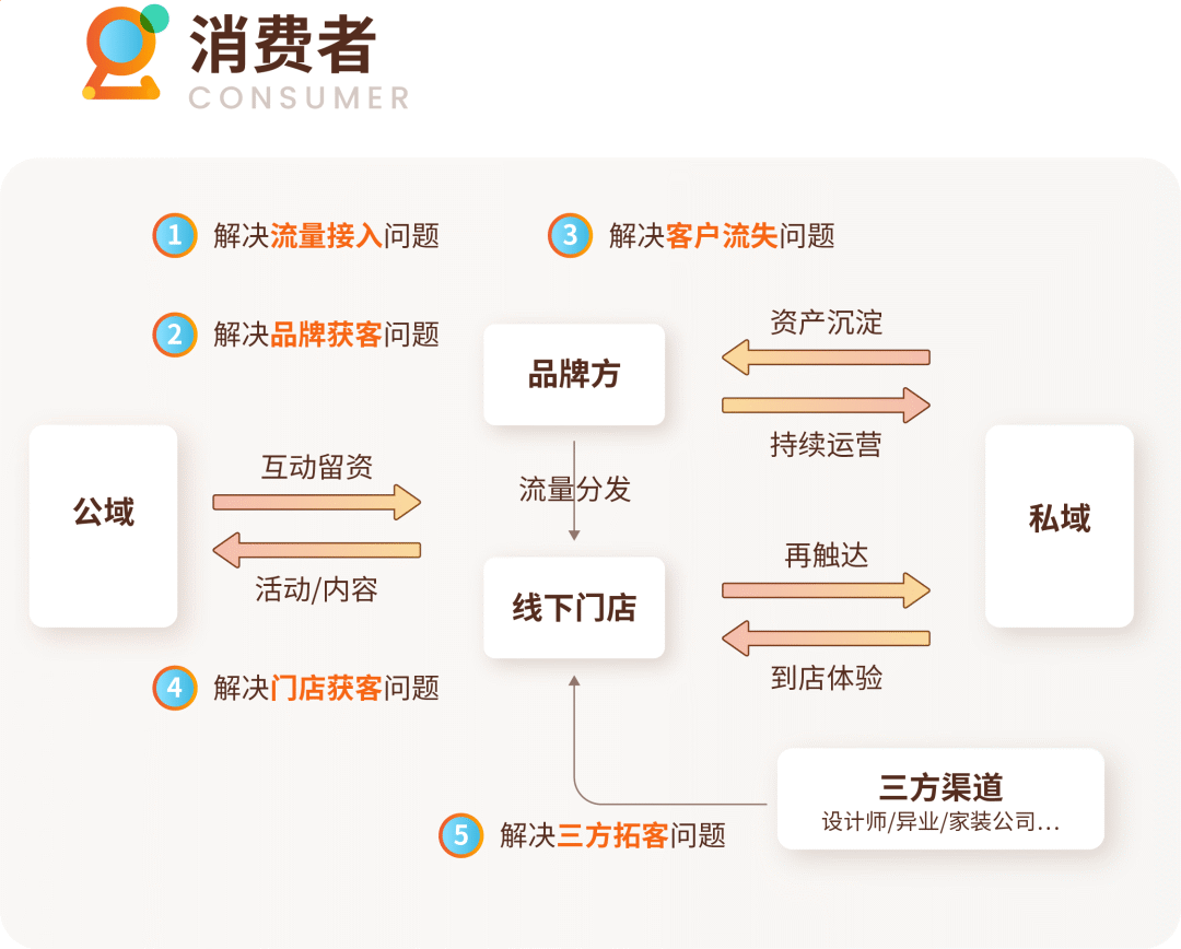 “三个面向”,第一时间是面向消费者的全域链接&再触达,品牌方必须要做到链接消费者,从以往重渠道的模式,转为以消费者为中心,顺利获得电商平台、直播/内容平台、社群/KOC/KOL等方式实现全域触达、精准获客和流量到店,品牌方与终端门店联合对意向客户、离店客户、老客户进行再触达和分层运营,实行全链路的体验和服务;