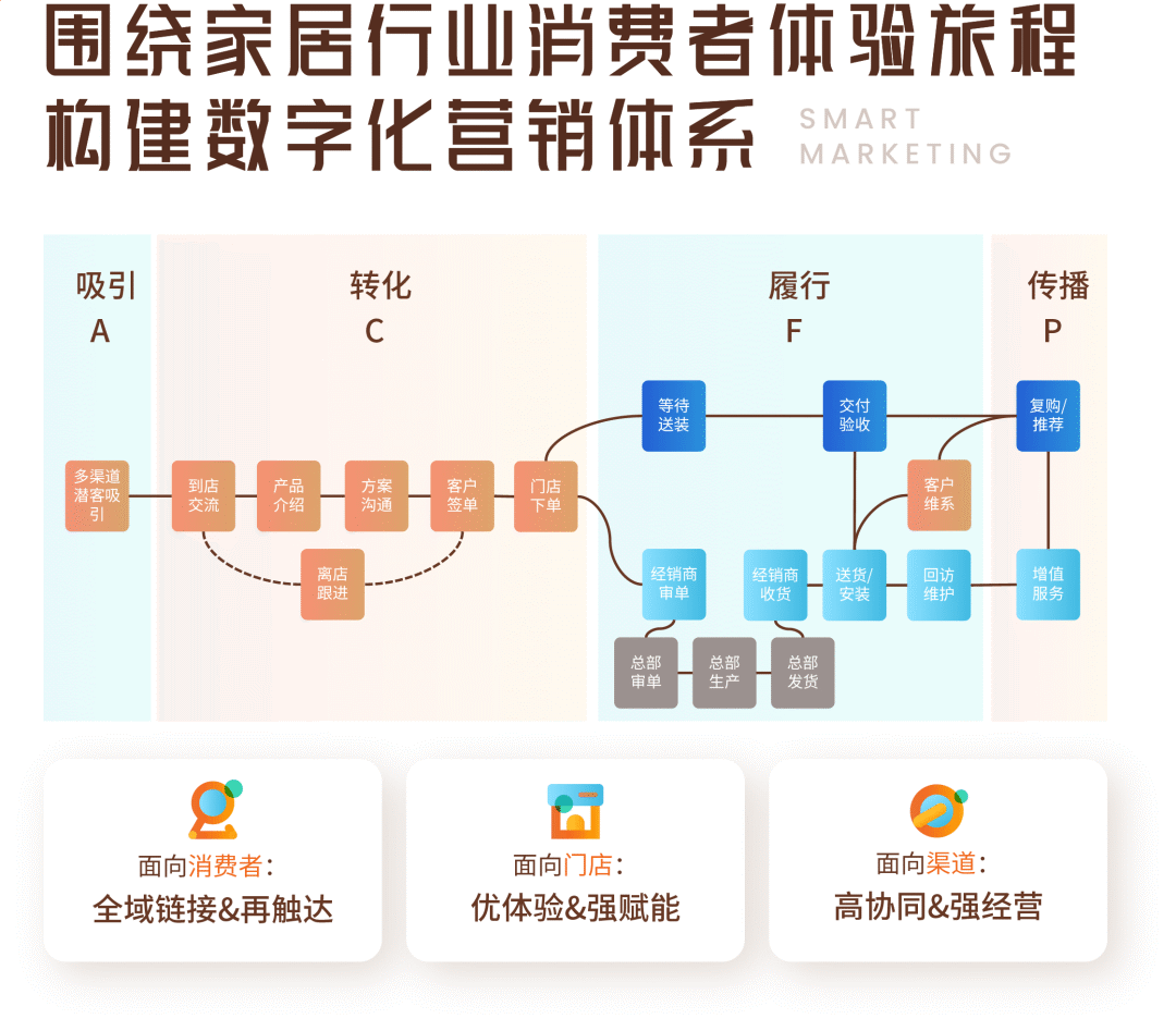 对重体验重服务的家居行业而言,线上线下各类营销广告的投入,最终还是要回归到线下门店的体验和成交中。也就是说需要线上线下、总部终端紧密配合,品牌方主导召开各类品效活动引流获客,门店落实邀约客户进店体验,以及对意向客户、离店客户、老客户有不同策略的持续触达和运营。此外,实行设计师、异业导购、家装公司等三方流量渠道的维系和导流也是日趋重要的一环。