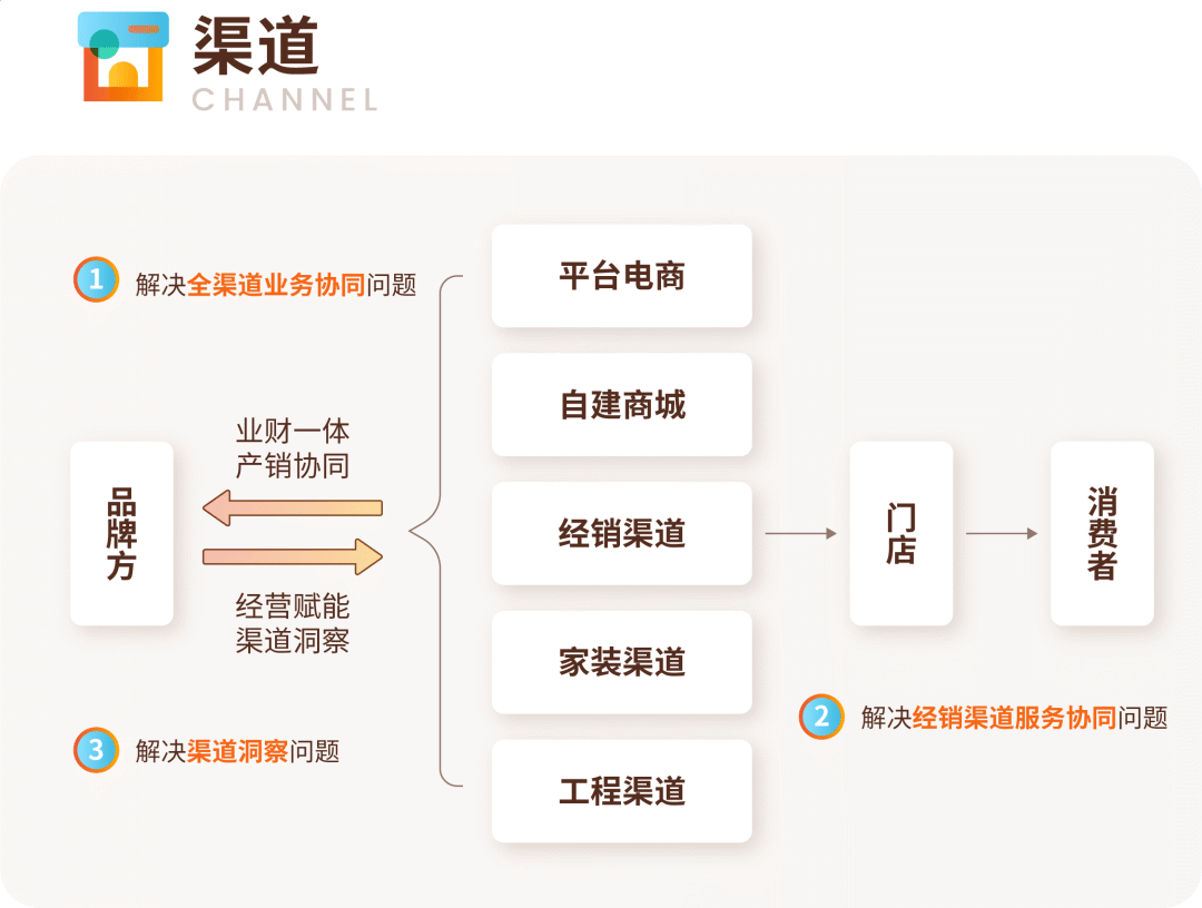 最后是面向渠道的高协同&强经营,对品牌方来讲,要实现与线上线下各渠道间的高效协同,包含全渠道基础数据和业务统一、流程高效及财务闭环管控,大力提升协同、交付效率,降低渠道管理成本和提升交付服务体验。