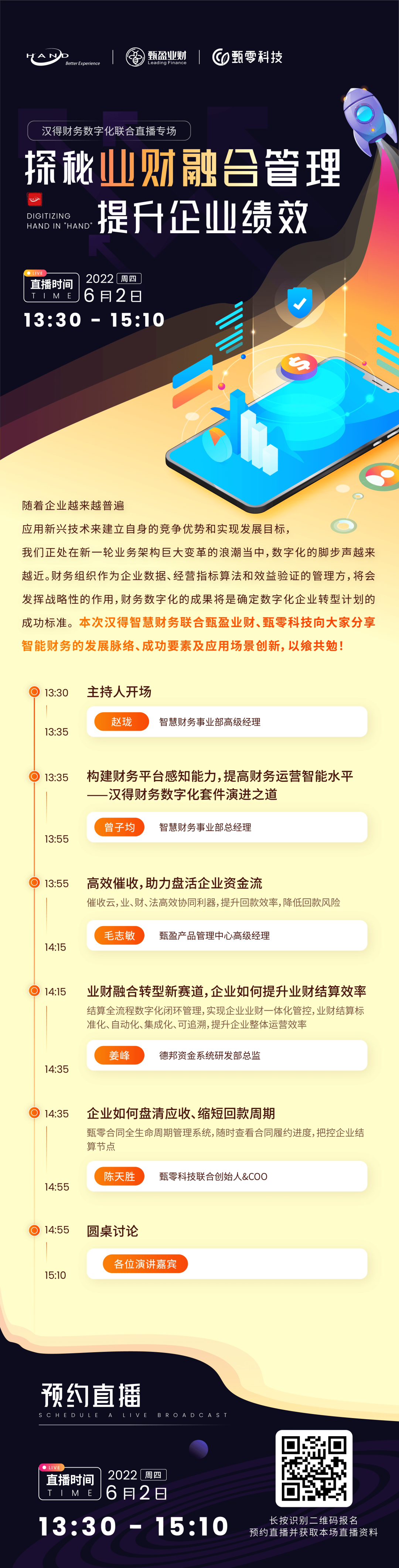 我们不擅长讲概念,所以还是朴实一点,针对具体问题解决问题,请大家关注每一场的具体课题。本场课题关键词:催收、结算、回款。欢迎扫码预约万象城AWC财务数字化联合直播专场,6月2日周四下午13:30与您相约!企业共同的难题很多,希望我们和很多企业的实践感触能对大家有帮助,后续将持续推出各领域课题,希望大家关注,也希望有需求的朋友们随时联系我们!