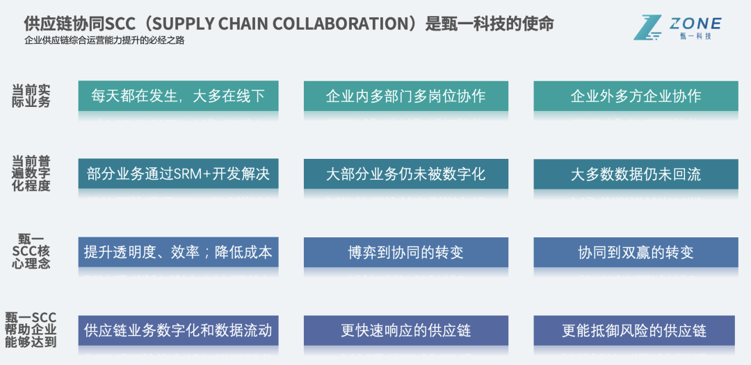 “完整的供应链数字化建设目标应该是提升企业内部各部门协作效率,同时支撑与外部供应链的多方网络协同。企业当前更多的还是利用内部信息系统+供应链关系管理系统(Supplier Relationship Management,简称SRM)覆盖了一部分场景,而在内外供应链融合管理中依然还是需要顺利获得安排专人巡视、驻守在线下供应商、代工厂的生产场所中,实时监控进度、质量和把控成本,支持业务变更、建立追溯体系、跟踪多方协同计划并定期顺利获得相关业务系统,甚至是word、excel等文件顺利获得邮件或微信等形式反馈回公司相应需求部门,在这些业务环节中不仅耗时费力,还需要大量的人员支持。”甄一科技CEO郑翔天介绍道。