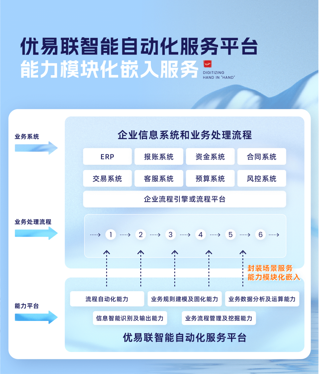 平台给予可选择、模块化、即配即用的数据集成、信息标识、AI识别、规则建模、数据分析、RPA、流程挖掘等信息技术服务,可以灵活、即时、轻代码地将模块化的服务嵌入到企业业务处理流程中,增强业务流程各个环节的智能化和自动化能力,解决企业数字化转型需求碎片化、整合落地难等问题。