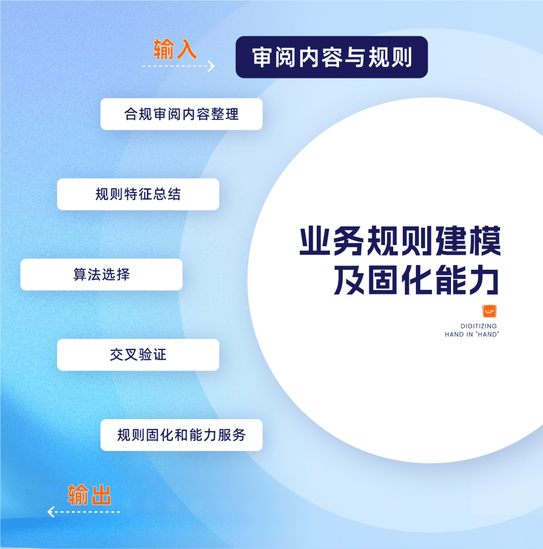 基于输入的企业业务待审阅内容与规则信息,利用对各类形态审阅材料的智能识别技术、数据合规质量评估算法及信息系统算法固化技术,将人工对各类材料的审阅内容和规则,落地到能力平台,进而替代人工完成之前认为只有人工才能完成的业务合规性审阅工作。