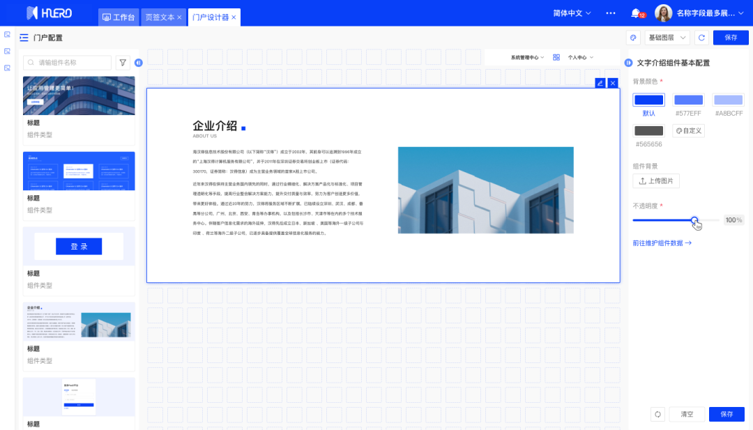 支持自行配置登录前门户;登录前门户配置内有组件轮播图,新闻公告、快速链接、页眉、页尾、文字介绍、logo组件、登录组件、登录按钮、联系咨询,可帮助公司宣传企业文化、产品信息等