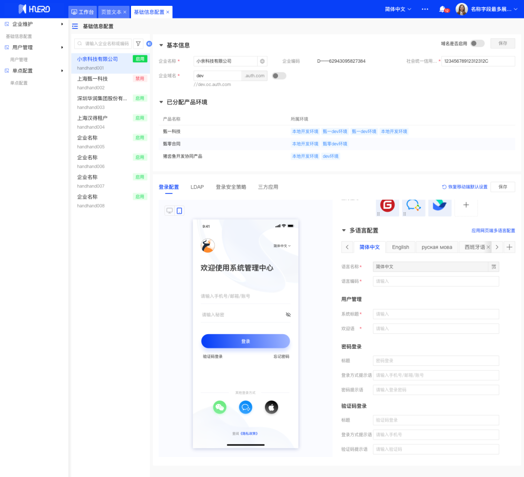 支持企业登录页配置,灵活设计页面布局、多语言和登录方式