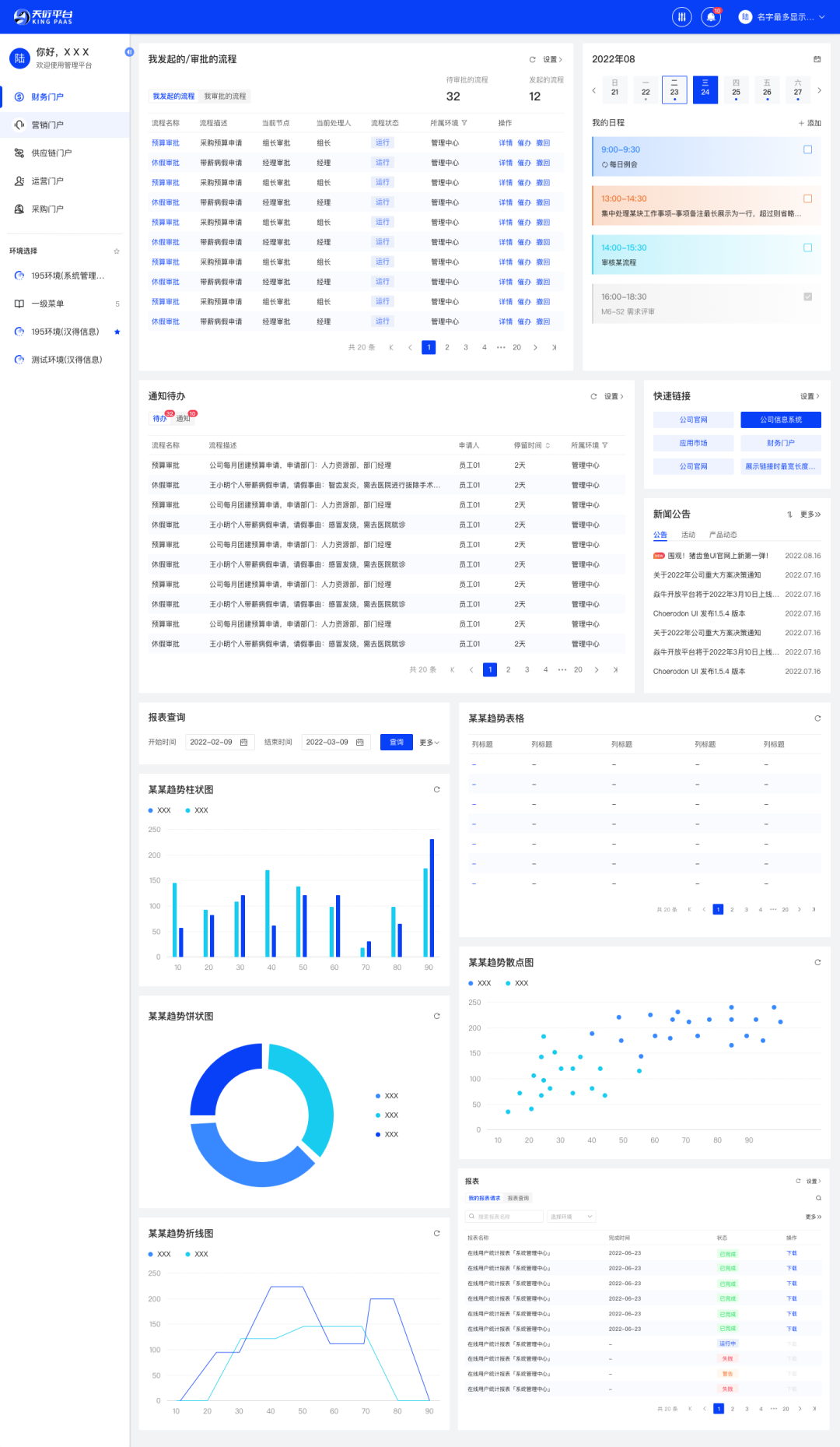 支持自行配置登录后门户;登录后门户配置内有通知待办、我发起的/审批的流程、平台报表、快速链接、轮播图、新闻公告、页眉、页尾、联系咨询,方便您总览所有待办与报表等,一键处理事项