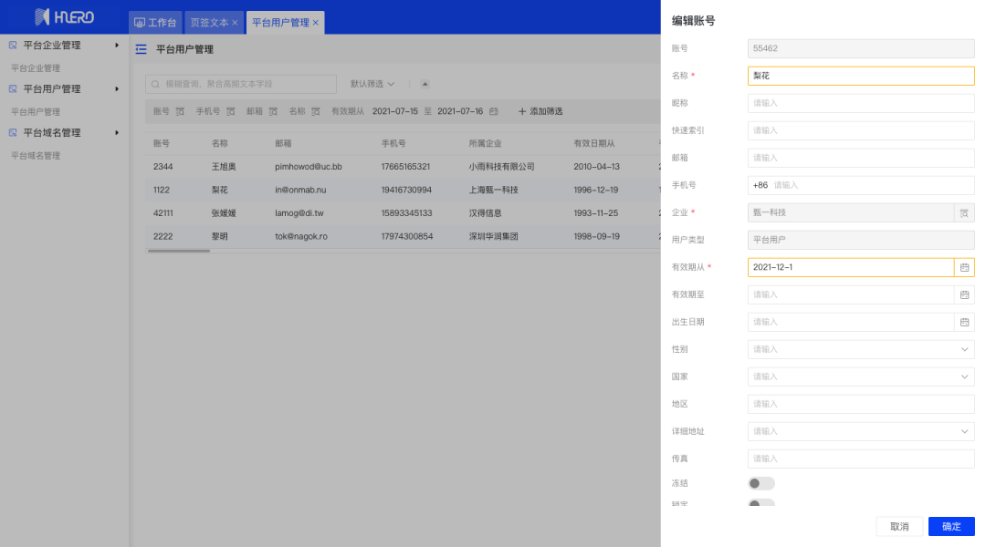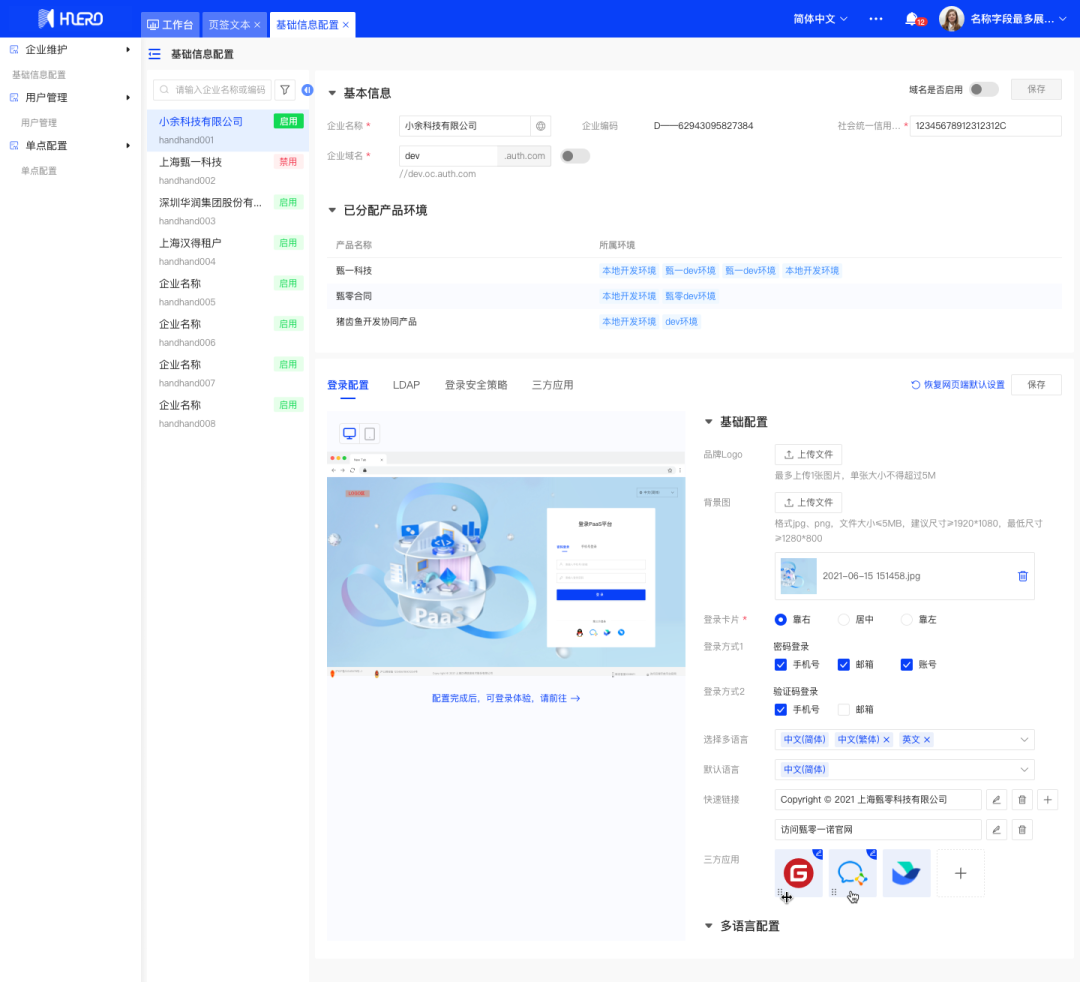 支持创建、配置企业信息,对企业租户的统一管理