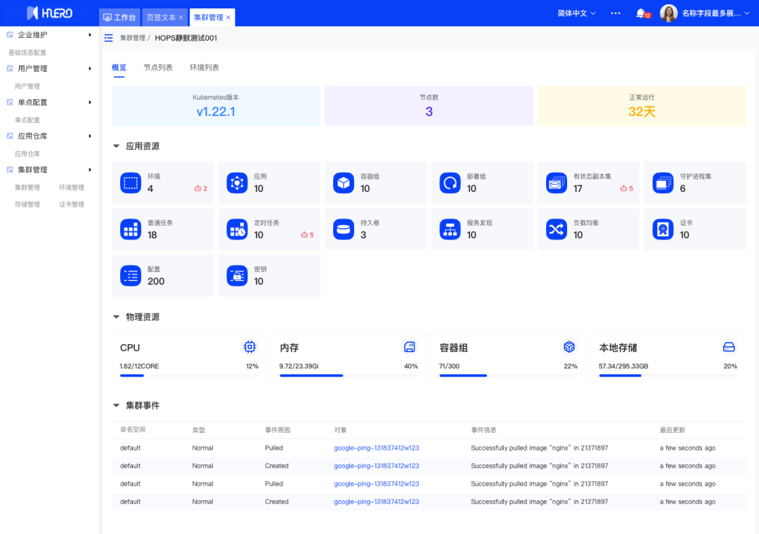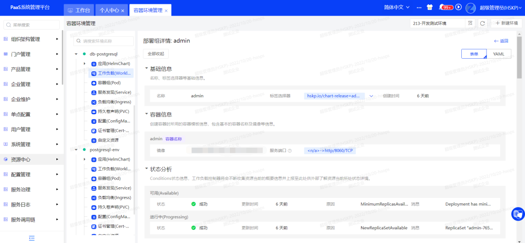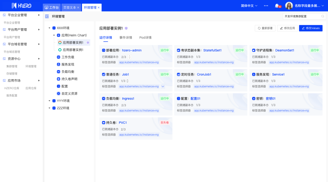 支持应用管理;容器环境可部署Chart应用、服务组件、基础组件;可查看应用的运行详情、事件详情、关联容器组、操作记录、种子数据等信息;主机环境可部署Ansible应用、服务组件、基础组件,可查看应用的组件详情、操作记录等信息