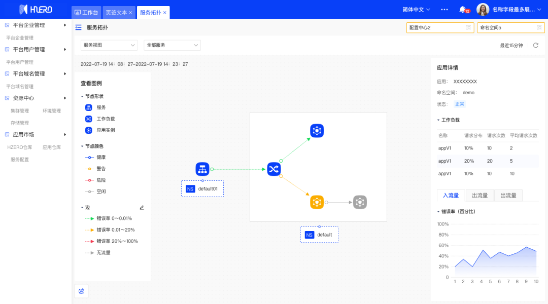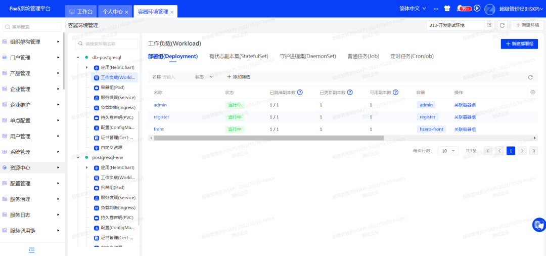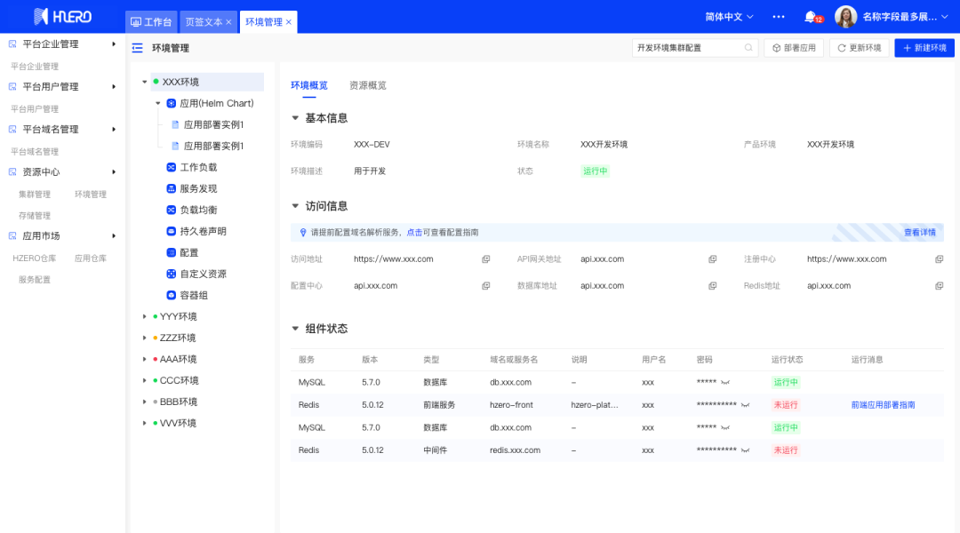 支持环境管理,新建空环境以单独管理K8S或主机部署组资源;新建HZERO环境以一键拉起HZERO系列产品使用;查看环境概览信息(包括基本信息、访问信息、组件状态等)以及环境资源及事件等;可在环境维度单独初始化种子数据