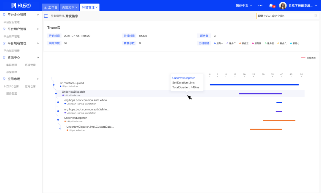 支持服务链路/拓扑管理,可查看服务调用链路,以快速分析服务应用问题;支持展示选中项目下服务间的调用关系等,排查服务间问题