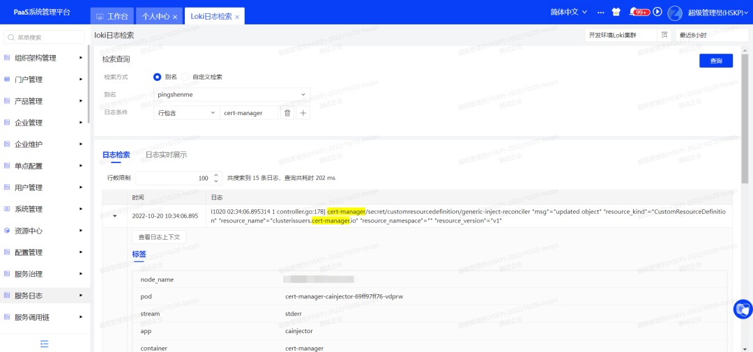 支持日志管理,可查看接入集群的日志信息