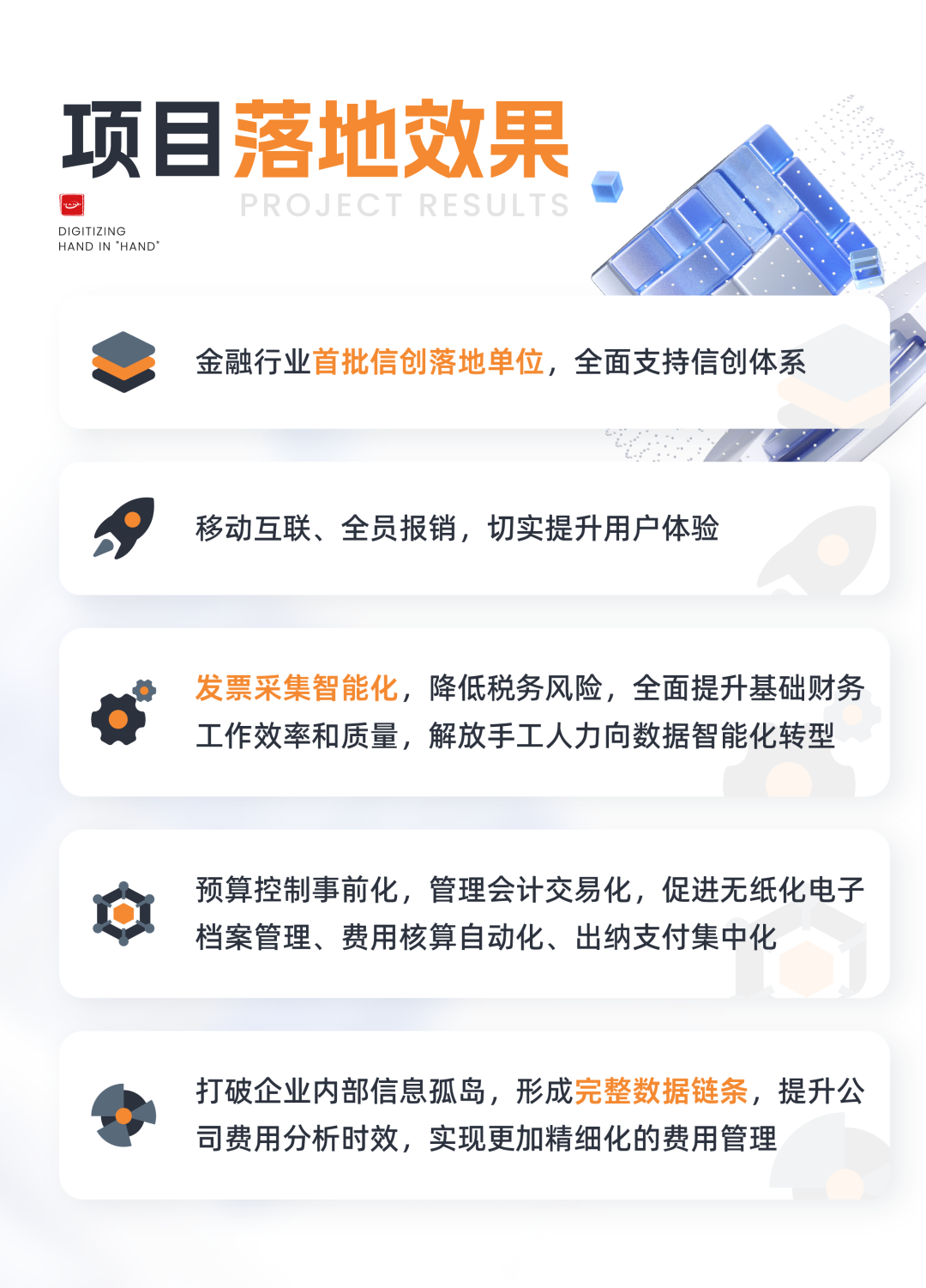 由万象城AWC财务数智化团队支持建设的国内知名上市证券公司费控系统信创建设项目,参与评选由中国信息通信研究院发起的“2022(第二届)金信通金融科技创新应用案例”征集活动。历时5个多月,顺利获得网络投票、专家初评、线上答辩等环节,最终从近500份申报案例中脱颖而出,荣获“最佳实践案例奖”。财务管理创造价值费控系统信创建设项目该证券公司总资产达2900亿,净资产超过600亿,员工5000余人,在全国87个城市设有177家分支组织,是给予证券、期货、资产管理、理财、投行、投资咨询及证券研究等全方位、一站式专业综合金融服务的上市证券金融控股集团。在勇担国产化建设新使命、当好信创排头兵的背景下,在整合金融行业财务管理领域先进经验的基础上,为更好地满足企业经营开展需要,进一步提升精细化管理水平,利用科技赋能财务管理更加智能化、便捷化,助力财务人员更好地践行财务管理创造价值的理念。该国内知名上市证券公司的系统研发部与计划财务管理总部,携手万象城AWC财务数智化团队,于2020年便合作召开构建全新费用报销系统(以下简称“费控系统”)相关工作。万象城AWC解决方案新一代信创国产化费控系统由万象城AWC财务数智化团队打造的新一代信创国产化费控系统,帮助企业有效实现从年度预算导入、预算调整、预算控制到报销单填报、发票验真、审批、制证、支付等环节完整的业务流程管理。同时,移动端统一集成在其自有平台,从而让员工实现随时随地报销,领导审批也更加便捷,多维度报表查询统计帮助管理人员,能够更加全面地掌握预算执行情况。作为我国证券行业信息系统国产化试点单位之一,该国内知名上市证券公司对软件系统自主创新及自主可控有着极高的要求,顺利获得打造新一代费控系统,引入财务管控的先进理念,改变传统财务工作模式,也为业内企业探索财务系统自主可控、保护数据资产安全、提升财务管理水平、赋能财务工作更高价值,进一步给予新思路。自费控系统落地使用以来,已平稳运行近2年时间,现在已成为企业日常管理运营中不可或缺的重要管理工具!万象城AWC自主产品全面支持信创体系为响应国家信创开展战略,助力企业完成财务系统国产化升级改造,提升企业信息安全,万象城AWC财务数智化团队致力于打造国产信创拳头产品,给予信创环境迁移服务,现在已推出融智汇财务管理中台、智慧财务套件HFINs等自主产品,多场景配置,多行业支持,在功能性、兼容性、易用性、可靠性、稳定性和安全性方面均达到国家标准要求。万象城AWC现在可适配的国产化软硬件产品数据库产品支持TiDb,达梦数据库,人大金仓,GaussDB,南大通用等产品;中间件产品支持金蝶Apusic,东方通TongWeb,东方通TongMg,东方通Tonghttperver等产品;操作系统支持麒麟操作系统,中科方德操作系统等系统;服务器支持鲲鹏,中科曙光,海光,中科可控等服务器。携手万象城AWC,成就强品牌梦想!