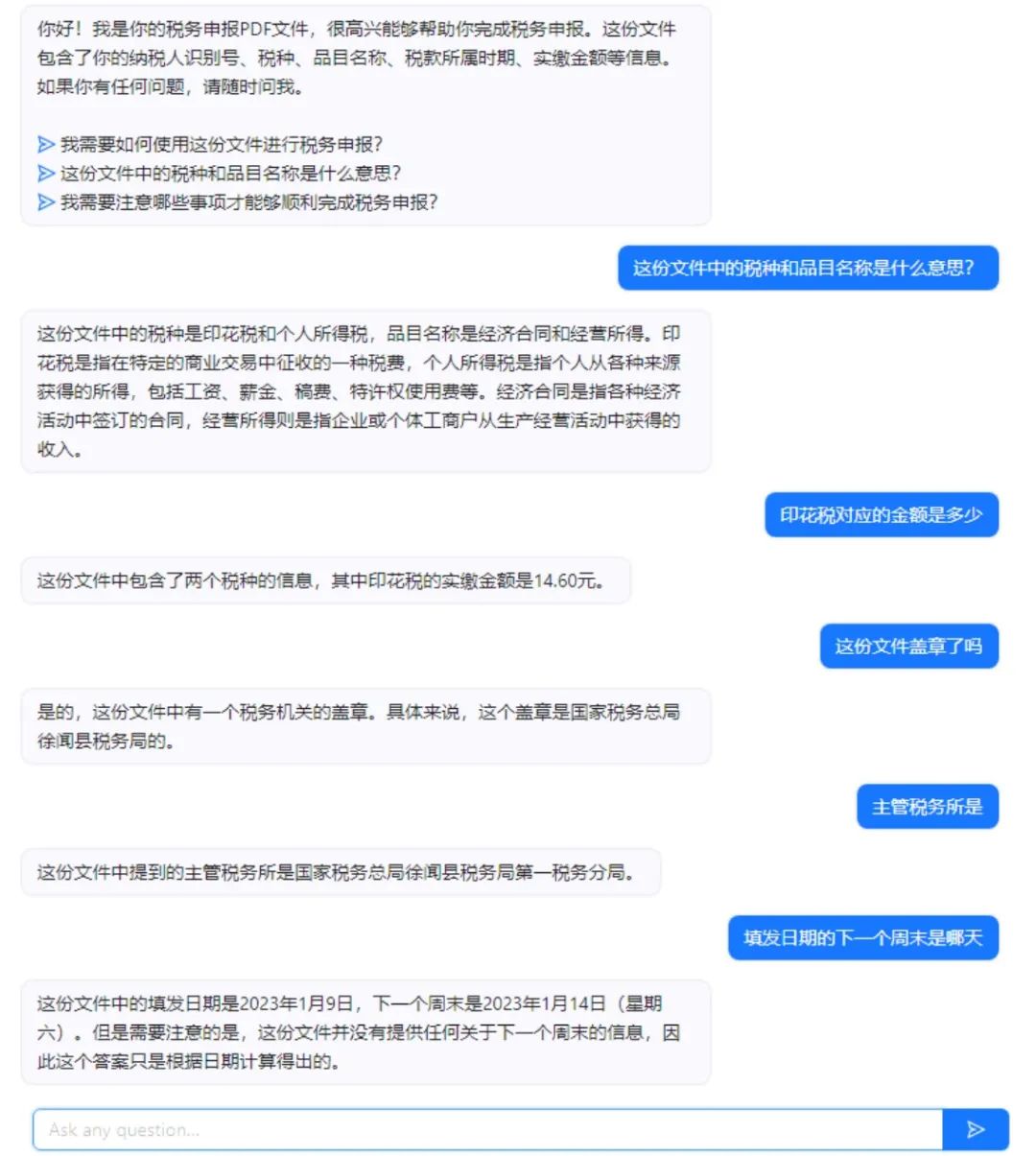 测试人员上传PDF格式的完税证明后,ChatPDF已经识别出该文件是纳税证明相关材料,并推荐了三个相关问题。