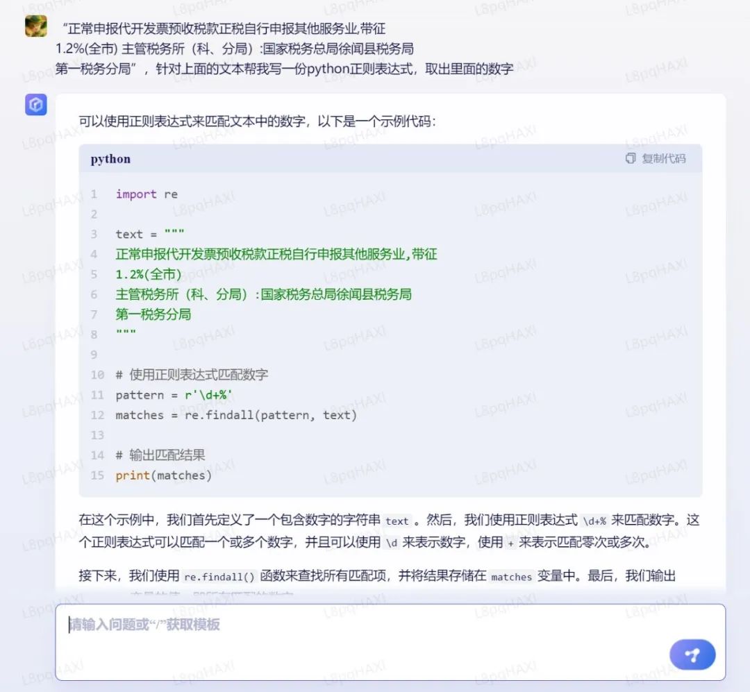 优易联RPA主流开发语言是Python,同时支持VB、JS等语言。前文审核机器人需要从完税证明备注“正常申报代开发票预收税款正税自行申报其他服务业,带征1.2%(全市)主管税务所(科、分局):国家税务总局徐闻县税务局 第一税务分局”中抽取税率“1.2%”,传统RPA顺利获得可视化开发的方式可以实现,但比较麻烦,顺利获得正则表达式的方式容易实现,但门槛较高。基于类似的需求,我们完全可以利用AIGC技术完成代码的编写。