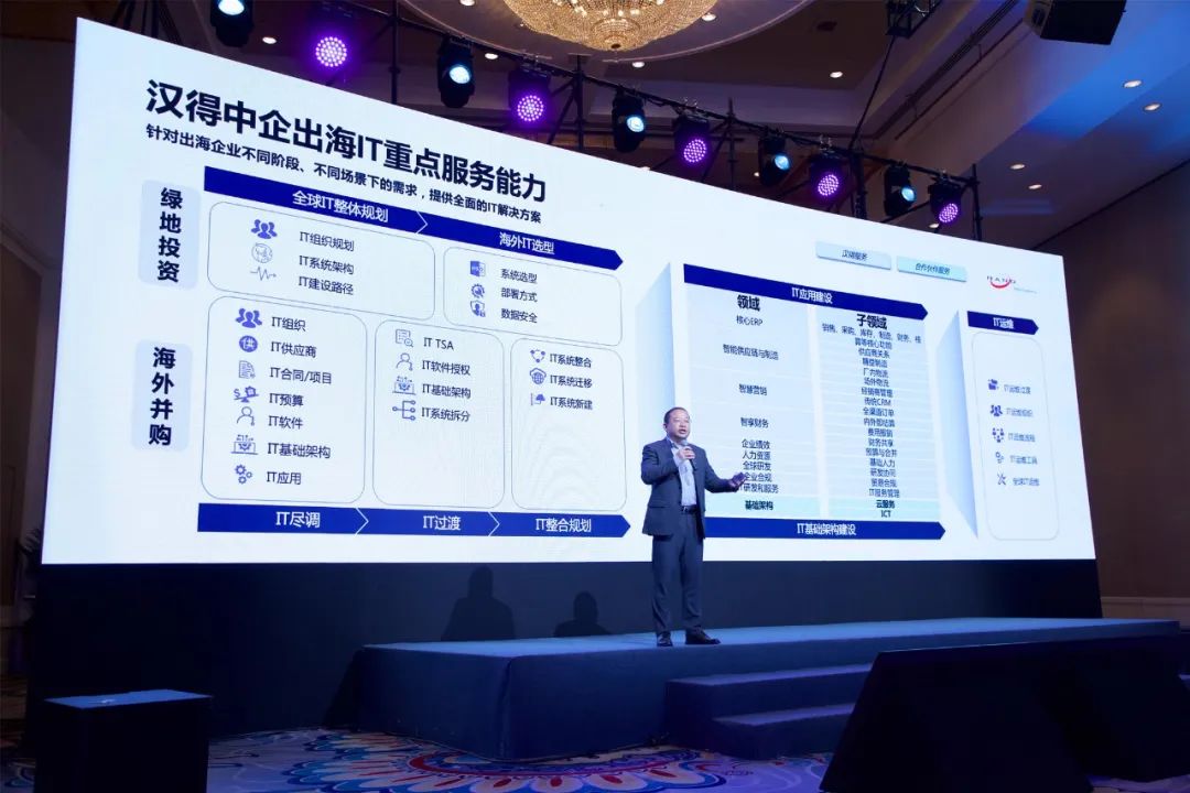 演讲现场,唐健向参会嘉宾们重点介绍了万象城AWC携手SAP共同助力多家头部客户成功出海的典型案例及经验分享,并特别强调了中企在走向欧美及东南亚的信息化建设中需要注意的重点事项。