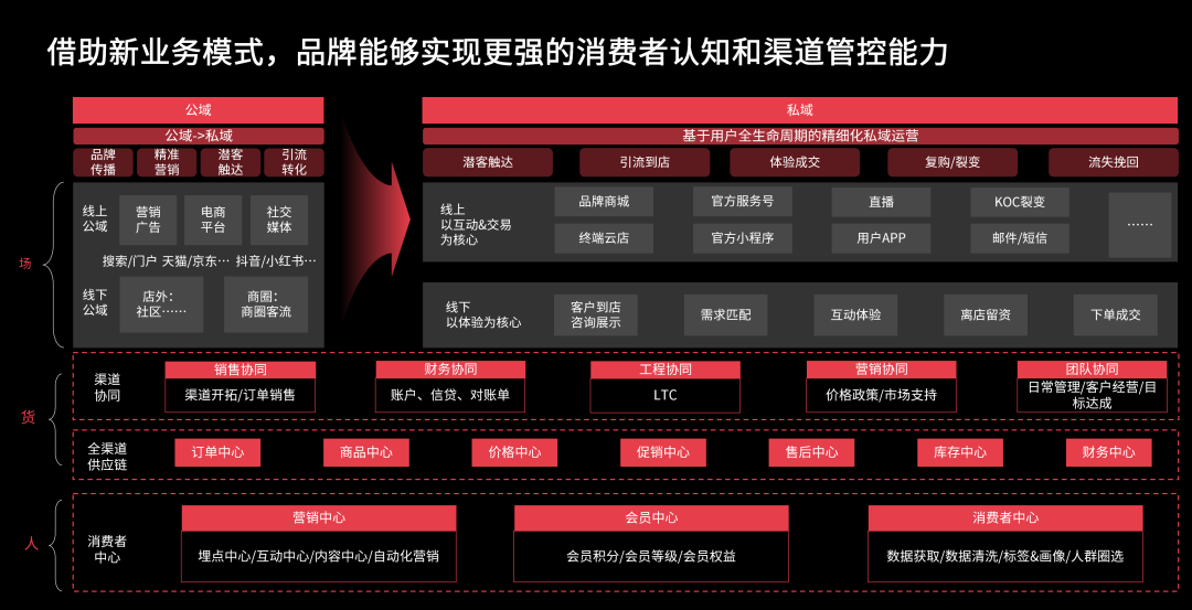 紧接着,他分享了第二个案例某高端厨电品牌。该企业搭建起以品牌为核心的线上交易渠道和链路,它将所有的线上销售线索以及订单,分配给到经销商,借助经销商的力量来完成整体的履约交付服务。本质上来说,该厨电品牌实现渠道资源的整合,构建起共赢生态,赋能上下游参与者。