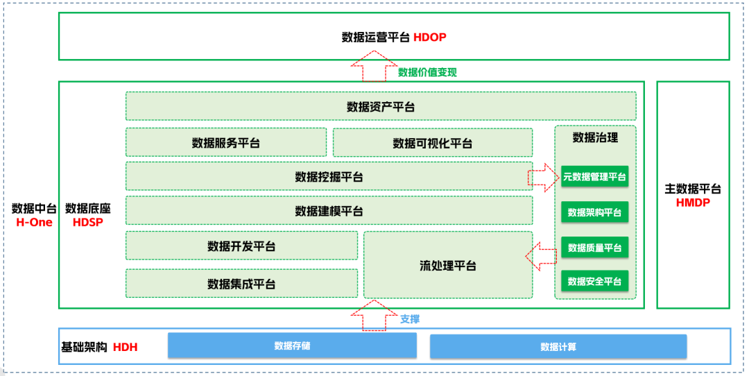 HDH的诞生意味着H-One有了里程碑式的开展,从给予数据汇聚、数据开发、数据治理、数据资产、数据服务、数据分析、数据运营为一体的数据全生命周期管理一站式服务,开展到包括基础设施在内的数据存储、计算、加工、处理、治理、运营一体化的全链路中台服务。