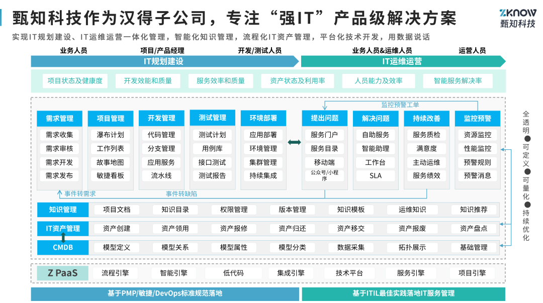 “强IT”表现在助力企业实现IT建设运维一体化,IT资产管理流程化,IT技术开发平台化,知识管理智能化;“强服务”表现在助力企业搭建数字化员工服务中心,数字化客户服务中心。甄知科技,始终致力于将“强IT”“强服务”理念、方法、实践沉淀为数字化产品,有助于企业数字化建设。