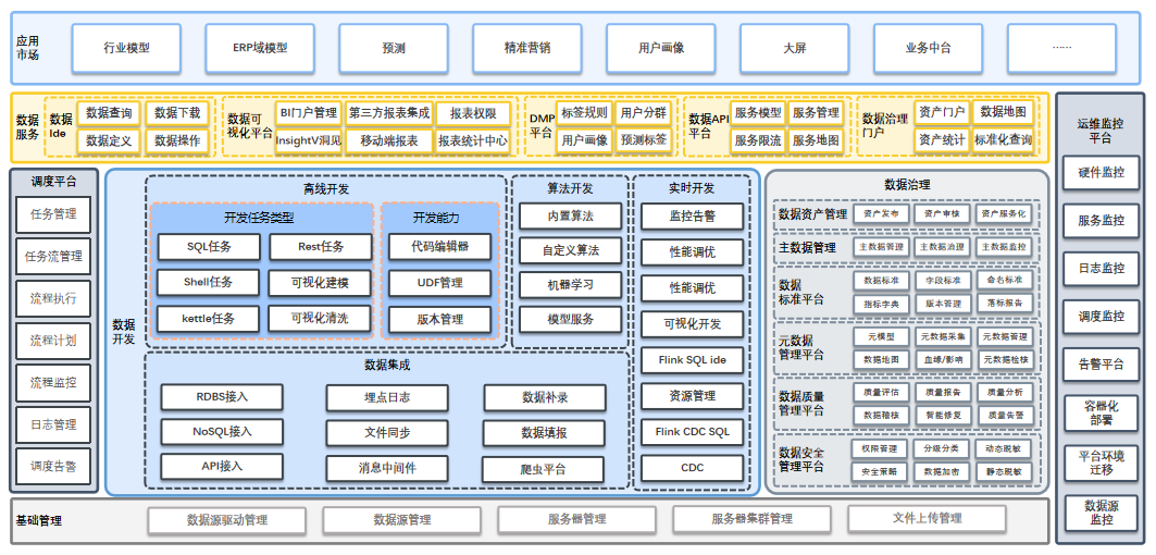 H-One(HDSP)包含数据采集、数据开发、数据治理、数据资产管理等全套数据中台建设组件,以及数据填报子产品InsightFilling和数据可视化子产品InsightV洞见。