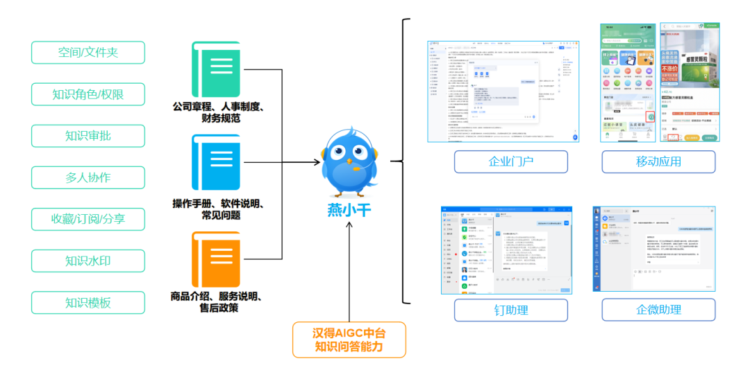 集燕千云知识管理 + AIGC中台知识问答 + 多渠道嵌入为一体的数字助理燕小千,为企业内外部用户给予一触即答的问询解答服务。