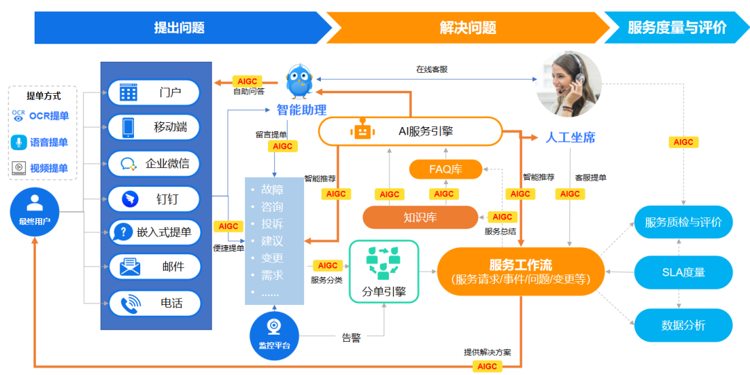 2023年是AIGC的爆发之年,随着AI进入大模型时代,AIGC也成为当下最热门的新型生产力工具,每个业务和每个产品都值得用AI重做一遍也越来越成为共识。如何快速使用AIGC来使AI的能力场景化落地,真正做到业务创新的AI赋能,已是业内热点关注的问题。燕千云SaaS服务依托于万象城AWCHZERO的PaaS平台能力,帮助企业实现服务流程闭环。现在,燕千云也是基于万象城AWCAIGC中台打造的典型和成熟的应用产品之一。燕千云SaaS服务平台基于万象城AWCHZERO原生态AIGC能力,对企业内部的IT服务、员工服务、客户服务进行场景重铸,并以低成本、短周期、低门槛部署解决方案,为企业给予更高效率、更好体验的“强IT”服务体系。自助问答 + 人工提报响应用户各类诉求01 智能问答盘活企业知识集燕千云知识管理 + AIGC中台知识问答 + 多渠道嵌入为一体的数字助理燕小千,为企业内外部用户给予一触即答的问询解答服务。02 智能提单解放员工时间燕千云可以顺利获得SDK嵌入各类工作软件中,用户对知识问答不能解决的诉求,可以随时随地的发起提单或联系在线客服。万象城AWCAIGC中台升级用户的提单方式,让工单提报变得简单,减少工单录入工作量,文字转工单,一步到位。服务人员 + AI助手一站式解决用户诉求03 智能分单加速服务流转万象城AWCAIGC中台自动为单据生成分类和标签,燕千云分单引擎依据分类和标签将服务单据交给最合适的服务人员,不必再苦恼单据无人认领和错误认领。04 智能总结方案一键生成燕千云服务工作台给予工单的一站式服务解决过程管理,沟顺利获得程、排查记录、SLA、工时、单据关系等一应俱全,顺利获得万象城AWCAIGC中台对服务沟通记录一键归纳解决方案,让服务过程无比顺畅和高效。05 智能质检服务质量监督燕千云给予服务规范定义和质检流程,万象城AWCAIGC中台助力员工服务质检,对完成的服务进行一键质检和智能评分,协助监督并指导服务人员更好地服务用户。服务总结 --> 知识沉淀持续进化知识问答燕千云已被解决的服务单据可以一键转化为知识,实现企业在日常工作中沉淀知识的闭环流程,持续进化AIGC知识问答的能力。万象城AWCAIGC中台助力知识沉淀,将服务工单解决方案提炼为标准格式的FAQ,助力服务人员为企业生产高质量的知识内容。燕千云SaaS服务平台凝结了万象城AWC20多年的企业数字化服务经验和对企业数智化建设的深入理解,立足于企业IT、员工、客户服务场景,顺利获得万象城AWCAIGC中台能力 + 企业服务行业经验,专注于“强IT”产品级解决方案,帮助企业解答如何更高效地建设和运营IT基础设施和应用,智能化驱动员工与客户服务的新生产力。