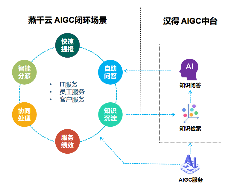 燕千云SaaS服务平台基于万象城AWCHZERO原生态AIGC能力,对企业内部的IT服务、员工服务、客户服务进行场景重铸,并以低成本、短周期、低门槛部署解决方案,为企业给予更高效率、更好体验的“强IT”服务体系。