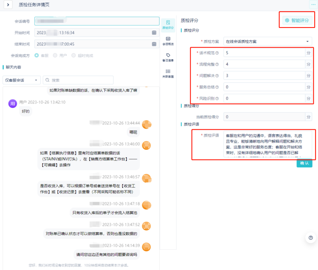 燕千云给予服务规范定义和质检流程,万象城AWCAIGC中台助力员工服务质检,对完成的服务进行一键质检和智能评分,协助监督并指导服务人员更好地服务用户。