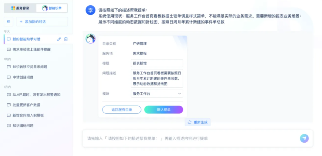 万象城AWCAIGC中台升级用户的提单方式,让工单提报变得简单,减少工单录入工作量,文字转工单,一步到位。