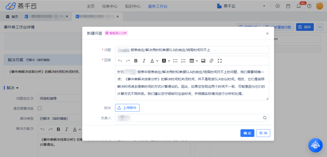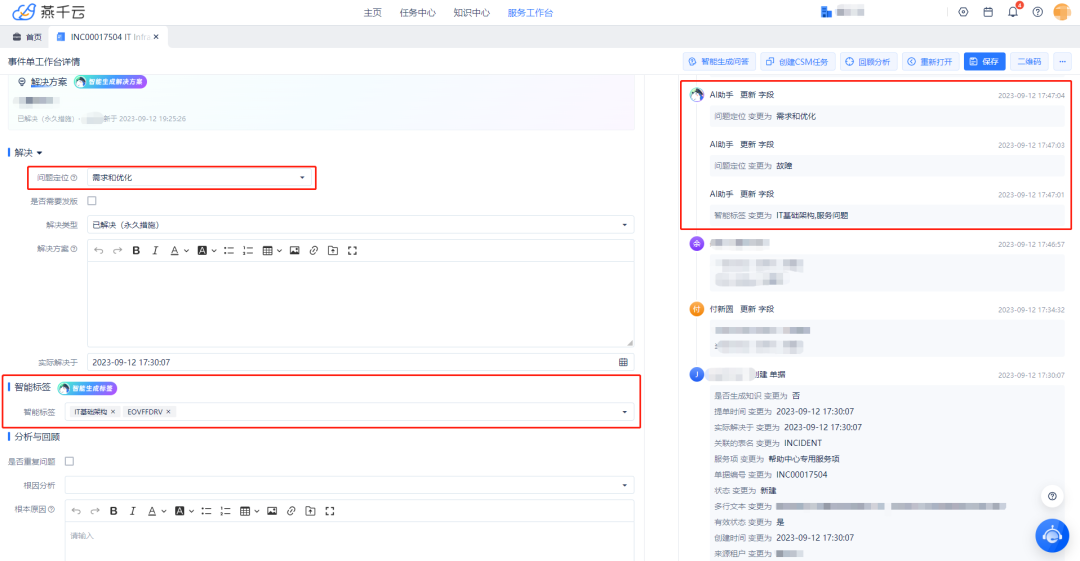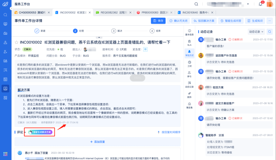 燕千云服务工作台给予工单的一站式服务解决过程管理,沟顺利获得程、排查记录、SLA、工时、单据关系等一应俱全,顺利获得万象城AWCAIGC中台对服务沟通记录一键归纳解决方案,让服务过程无比顺畅和高效。