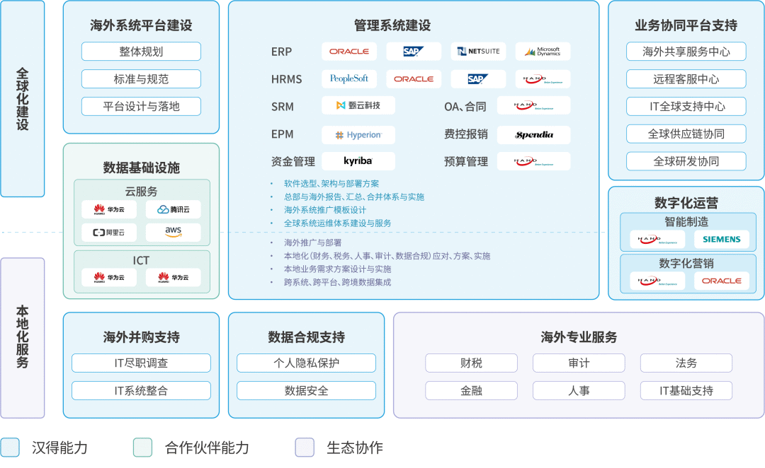 围绕 We-Move/Hi-Move 升级迁移、GROW with SAP 上云、SAP BTP 与 HCM 等能力,给予评估—实施—保障的一站式方案,覆盖中企出海与全球交付。
