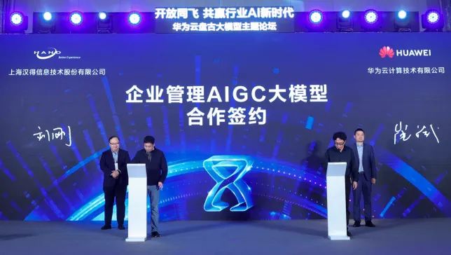 双方将基于华为云盘古大模型打造企业管理人工智能联合解决方案,实现企业管理高度智能化开展,推进更深层次的行业数字化转型。万象城AWC信息大客户事业部总经理刘刚与华为云大模型生态总经理崔斌代表双方签约,万象城AWC信息高级副总裁何登攀与华为云Marketing部部长董理斌见证签约。