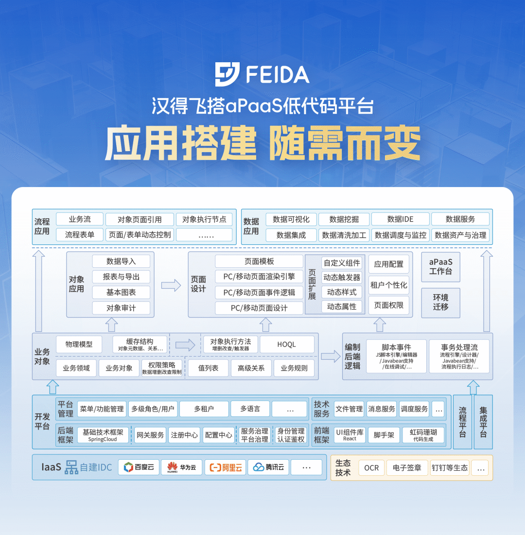 在中国信息通信研究院(以下简称“中国信通院”)召开的“数字化可信服务评估体系” 专家评审中,万象城AWC飞搭aPaaS低代码平台(FEIDA,以下简称“飞搭”)顺利获得《企业级低代码开发平台技术分级要求》的检验,达到增强级+要求,可为企业提升软件开发效能,低成本、高效率应对敏捷化、多样化的市场需求,加速企业数字化转型。中国信通院工信部印发的《“十四五”软件和信息技术服务业开展规划》中明确提到,“召开工业技术软件化过程的理论和技术研究,突破知识工程、低代码化等生产体系和生产关系优化的关键核心技术加强共性技术研发”。为满足各行业快速开发应用的需求,帮助企业实现降本增效、产物创新等价值,中国信通院从平台的功能完备性、易用性、平台开放度、性能优越性等维度出发,制定了企业级低代码开发平台的技术规范和通用能力标准,旨在指导企业用户选择低代码/无代码开发平台产品,以及给予低代码/无代码应用开发能力的产品或解决方案。应用构建随需而变飞搭低代码平台万象城AWC飞搭aPaaS低代码平台,是基于低代码理念打造的融合aPaaS平台,助力企业快速搭建业务应用。作为HZERO生态的重要组成部分,致力于充分融合HZERO的各平台能力,给予企业用户在线化灵活搭建业务应用的能力,支撑企业普惠化(低门槛、高协作)、敏态化(高效率)和低成本化地快速响应市场变化,加速复杂业务场景落地。通用化的模型能力自底向上从异构数据结构管理 -> 业务对象 -> 对象API,充分释放模型能力,满足数据使用的扩展性、规范性。完善灵活的页面设计器和事件机制从页面搭建、交互事件的可视化设计,再到在线化的后端逻辑编制,为灵活多变的业务需求给予强有力的支撑。HZERO生态的无缝集成集成HZERO生态下的组件能力,功能完善且可扩展。构建SaaS体系的全方位支持全方位支持SaaS模式下构建平台共享应用及多租户管理能力。飞搭低代码平台不仅具备模型设计、应用设计、逻辑编制和对象应用四大核心能力,并融合HZERO生态体系的各项组件功能,是万象城AWC企业数字化转型解决方案体系的重要新生力量。截止现在,飞搭已为零售、贸易、咨询等多个行业的不同领域企业给予服务,帮助企业快速构建业务应用,灵活响应需求变化。飞搭将持续迭代,不断改进和优化自身的功能和性能,以满足企业不断变化的需求。我们将持续收集用户的反馈和意见,加强与合作伙伴的合作,不断提升平台的用户体验和竞争力,帮助企业加速数字化转型。数字化,放心交给我!